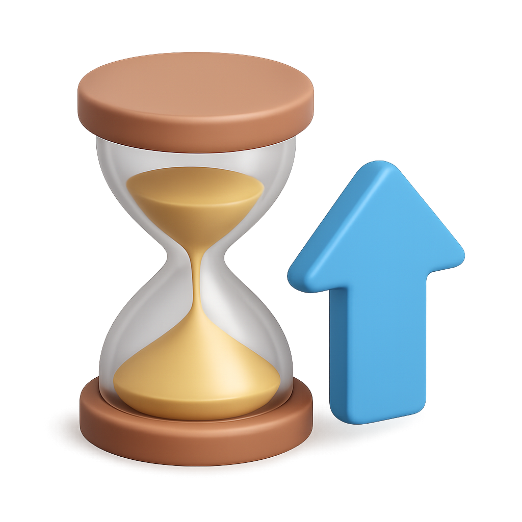 /Collection: /by davooda/Type: PNG/A visually striking 3D icon featuring an hourglass with a golden sand timer, accompanied by a blue upward arrow. The design emphasizes depth and volume with a transparent background.