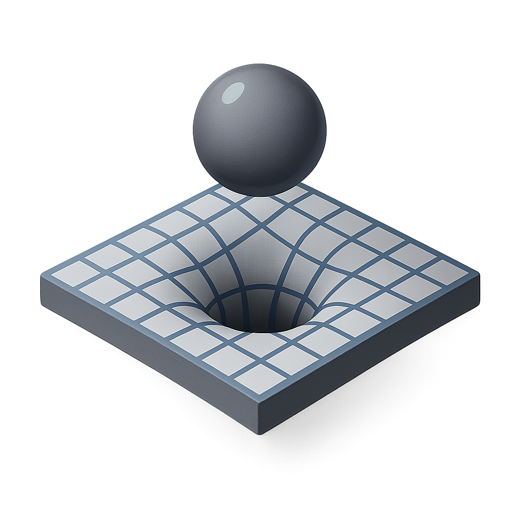 A 3D representation of a spacetime curve, featuring a black sphere above a grid-like, concave surface. The icon is designed with a transparent background and an isometric perspective.