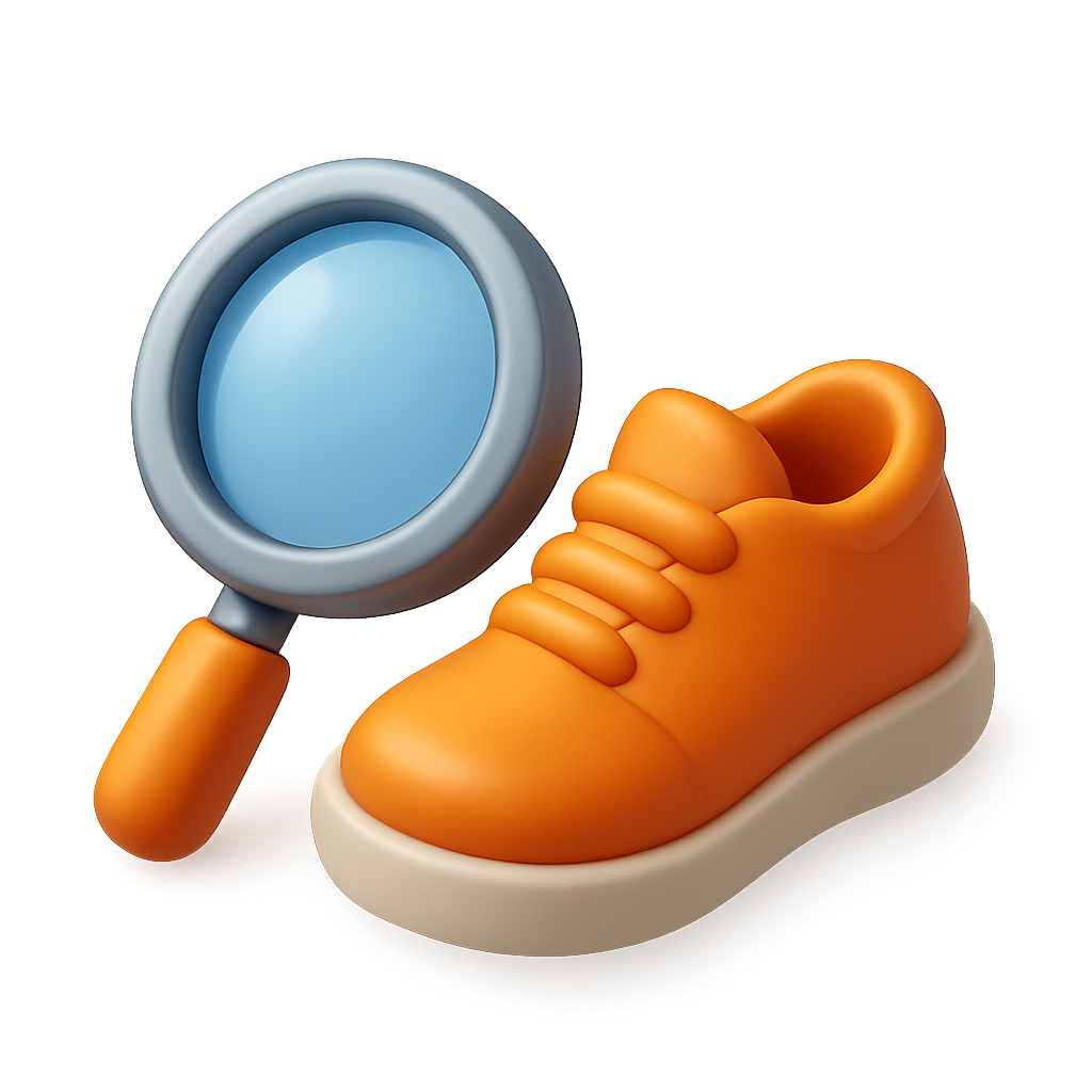 /Collection: /by davooda/Type: PNG/A vibrant 3D illustration featuring a stylized orange shoe alongside a blue magnifying glass. The design has a transparent background and showcases an isometric, volumetric perspective.