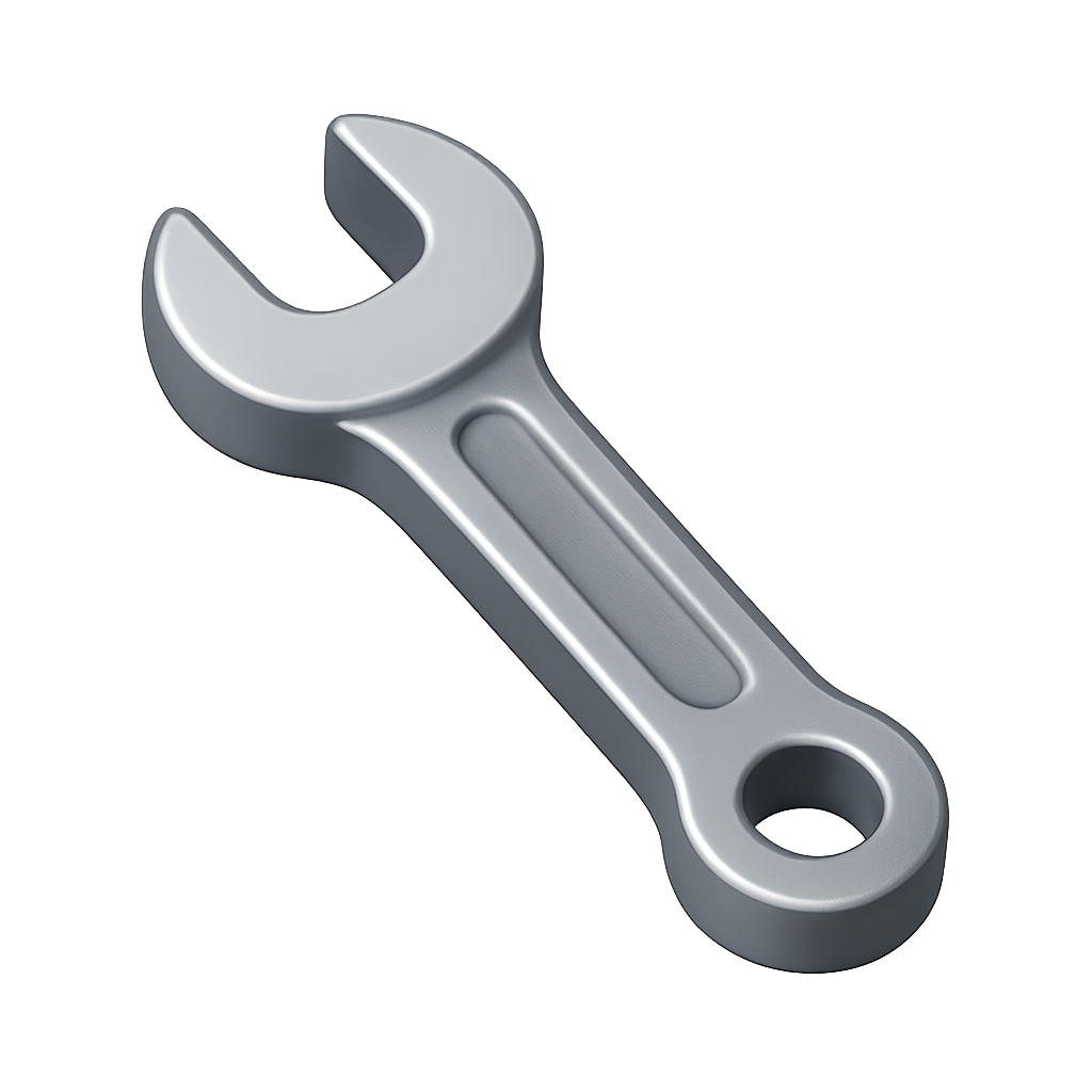 A sleek, metallic 3D wrench icon presented in a three-quarter view. The design features smooth edges and a glossy finish, enhancing its volumetric appearance against a subtle gradient background.