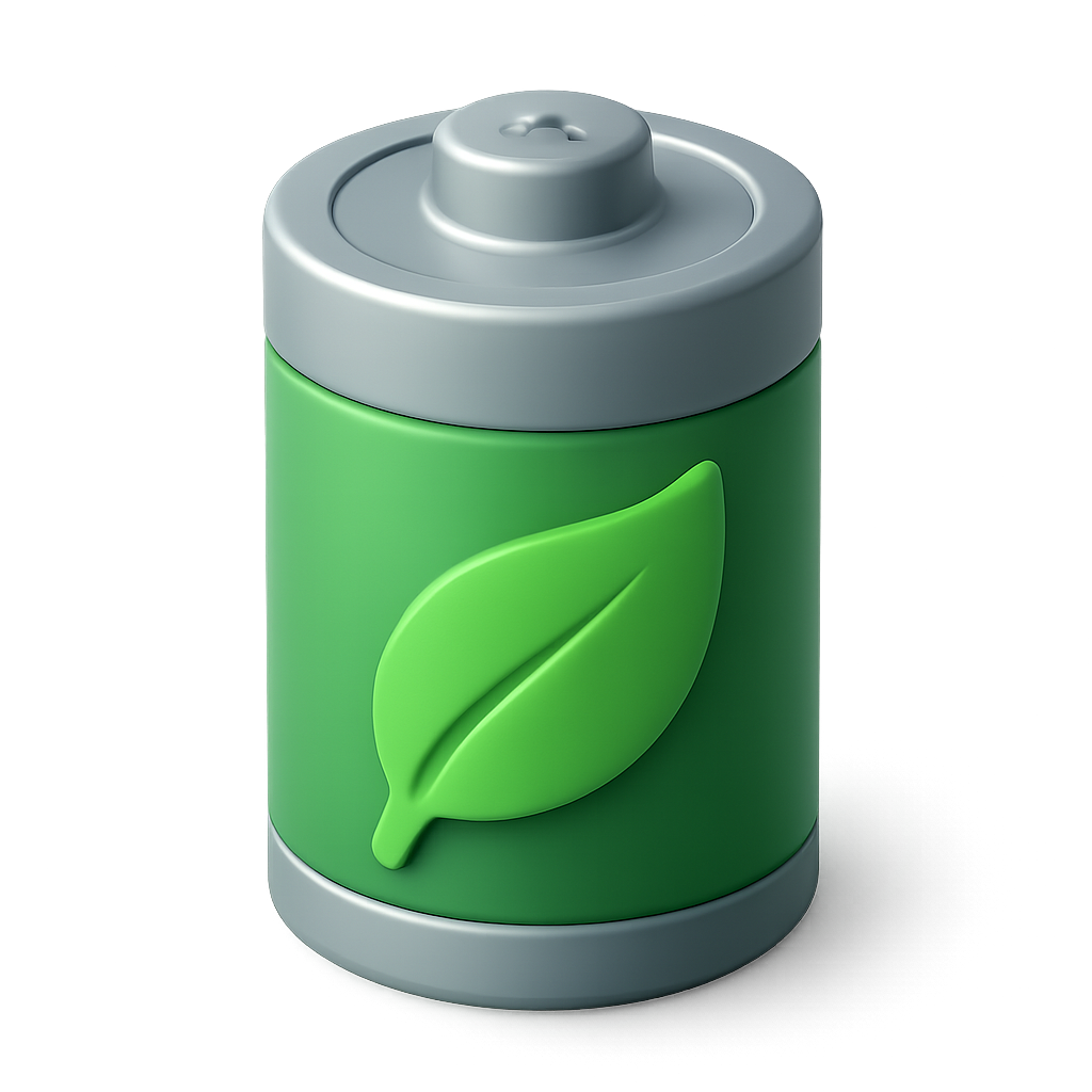 A modern 3D icon of a battery featuring a green leaf design, symbolizing eco-friendliness. The battery has a transparent background and a three-quarter view.
