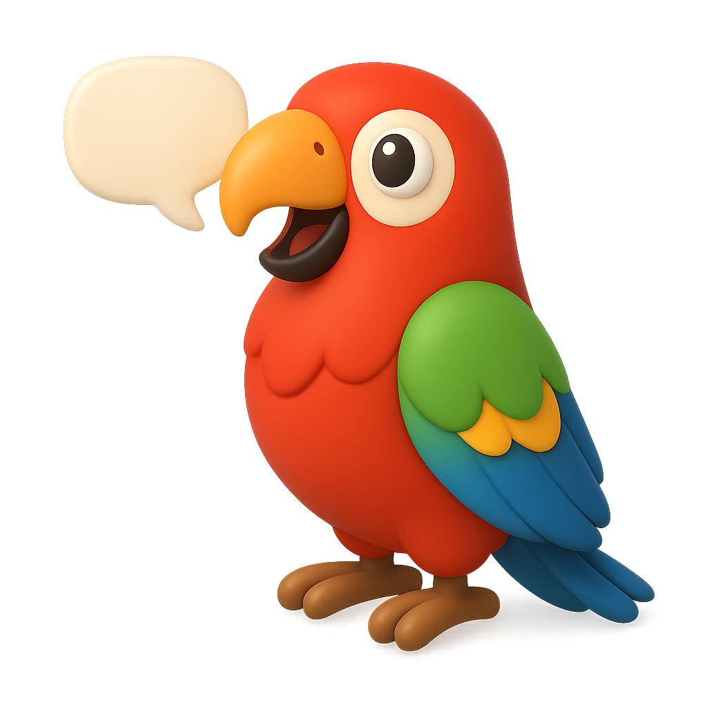 A cheerful 3D icon of a colorful parrot with a red body and green and blue wings. It has a friendly expression and a speech bubble, set against a softly blurred background.