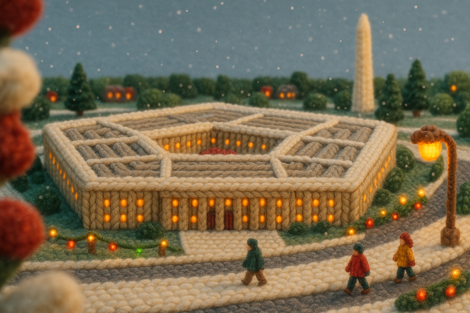 A whimsical, snowy depiction of the Pentagon crafted from thick woolen threads, featuring vibrant colors and holiday lights. Small figures stroll past amidst a festive atmosphere.