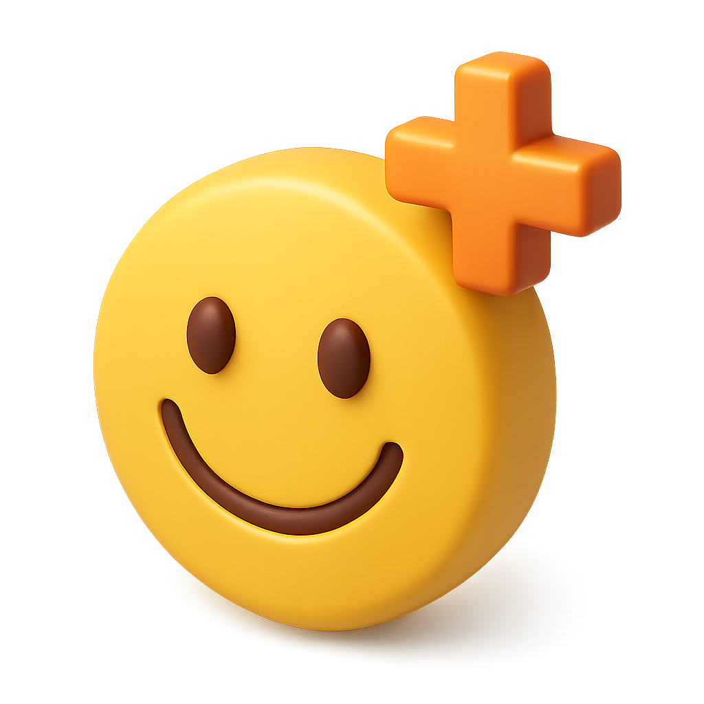 /Collection: /by davooda/Type: PNG/A vibrant 3D smiling face icon with a glossy finish, featuring a plus sign above it. The icon has a transparent background and is rendered in a three-quarter isometric view, giving it a volumetric appearance.