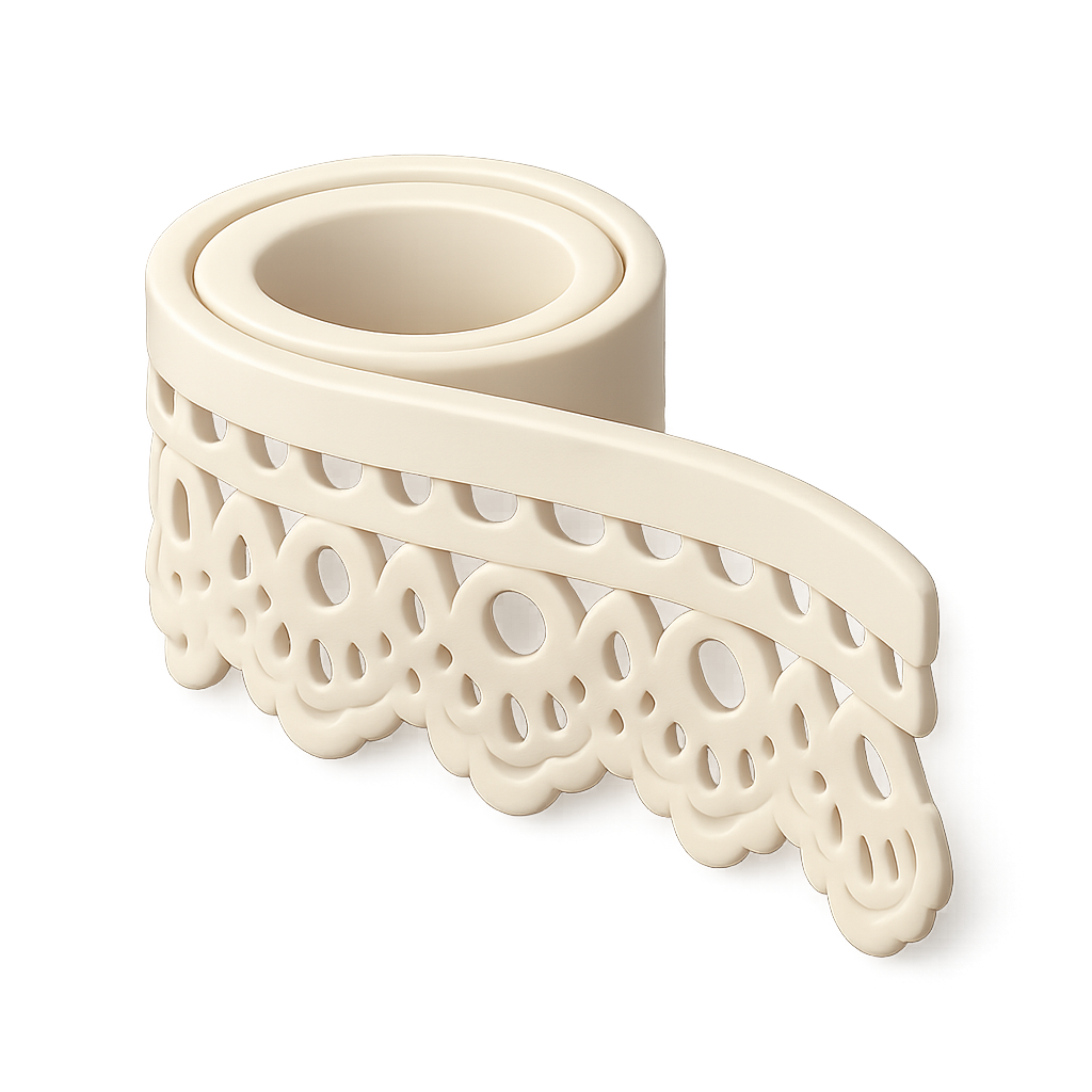 A stylized 3D lace trim icon depicted in a three-quarter isometric view. The design features intricate lace patterns with a smooth, glossy finish, set against a soft gradient background.