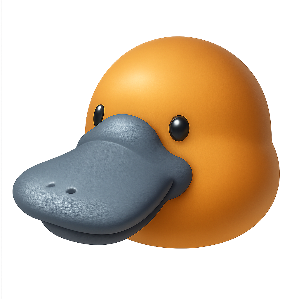 A stylized 3D representation of a platypus with a duck-like bill, featuring a glossy finish and isometric perspective. The icon showcases volumetric details against a transparent background.