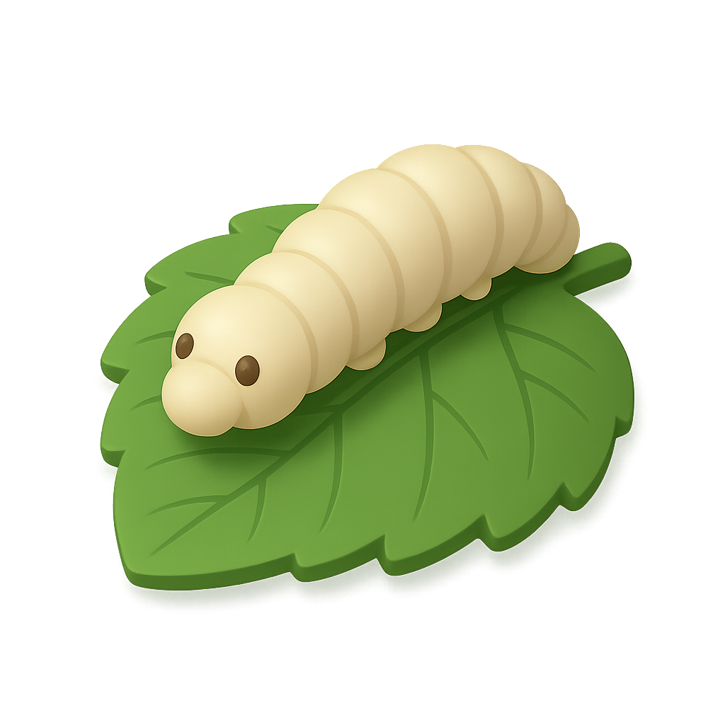 A stylized 3D representation of a mulberry silk worm resting on a green leaf. The worm is light-colored with a smooth texture, showcasing a cute design in an isometric view.