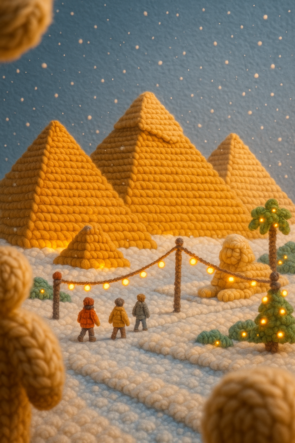 /Collection: /by davooda/Type: PNG/A charming 3D scene depicting pyramids crafted from thick yarn, set in a snowy landscape. Small figures admire the glowing lights, enhancing the festive ambiance.