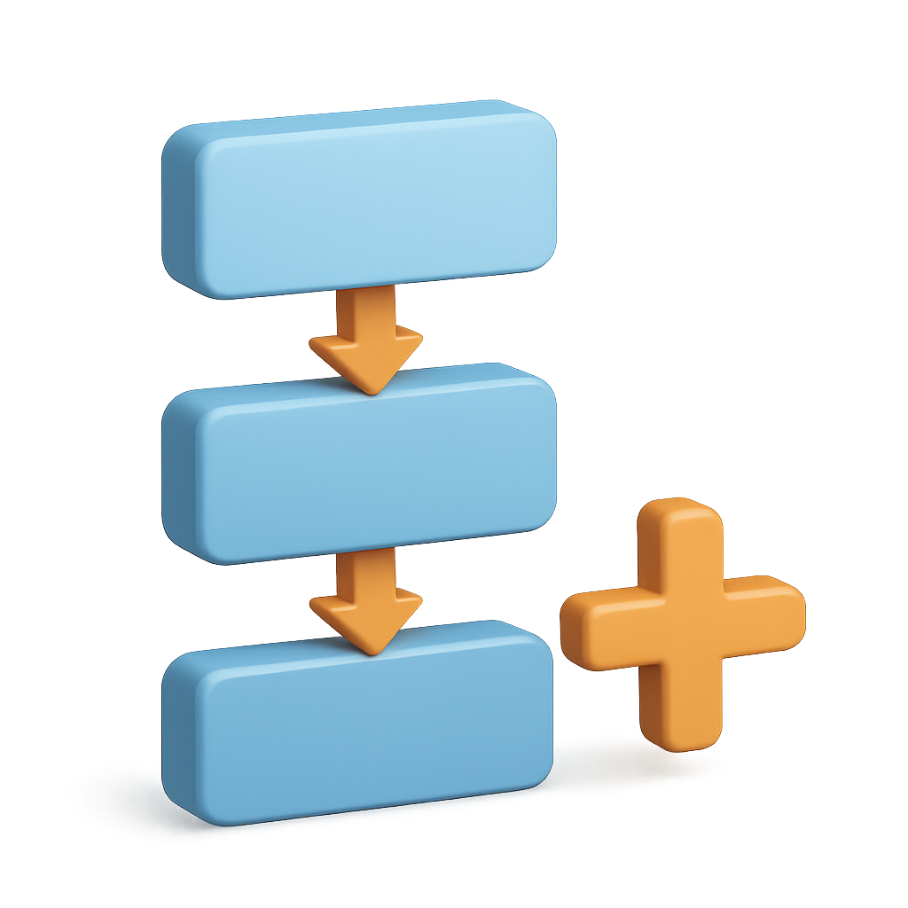 The image features three stacked blue rectangles with downward arrows between them, creating a 3D effect. An orange plus sign is positioned adjacent, enhancing the design's focal point.
