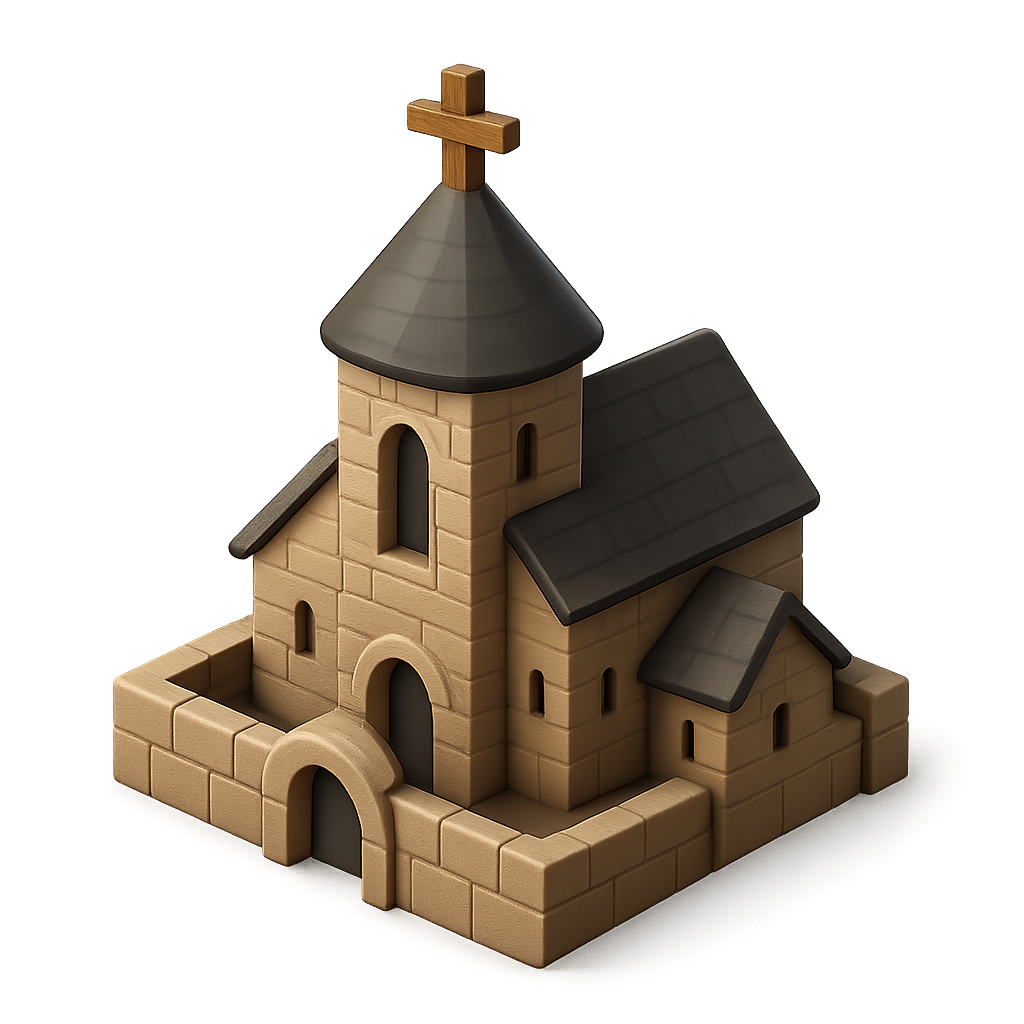 A stylized 3D representation of a dark ages monastery featuring a cross atop its dome, with stone-like textures and a volumetric feel.