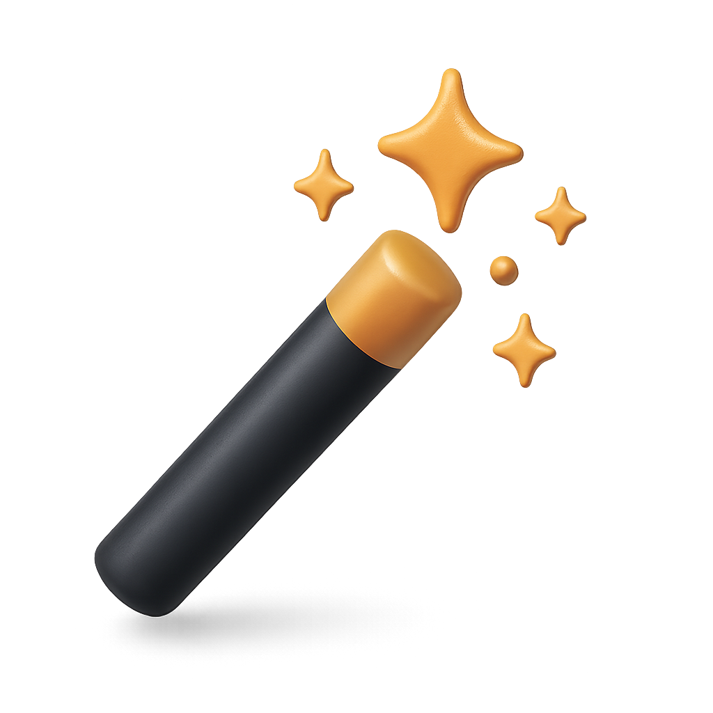 /Collection: /by davooda/Type: PNG/A stylized 3D magic wand featuring a sleek design with an orange tip and sparkles emanating from it. The icon is set against a soft, blurred background, enhancing its volumetric appearance.