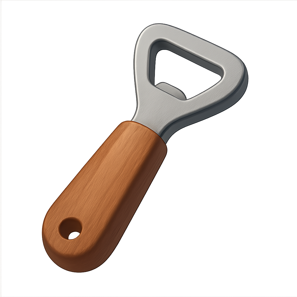 /Collection: /by davooda/Type: PNG/A visually appealing 3D illustration of a lever bottle opener, showcasing a metallic head and a wooden handle. The design features a three-quarter isometric view with a transparent background.