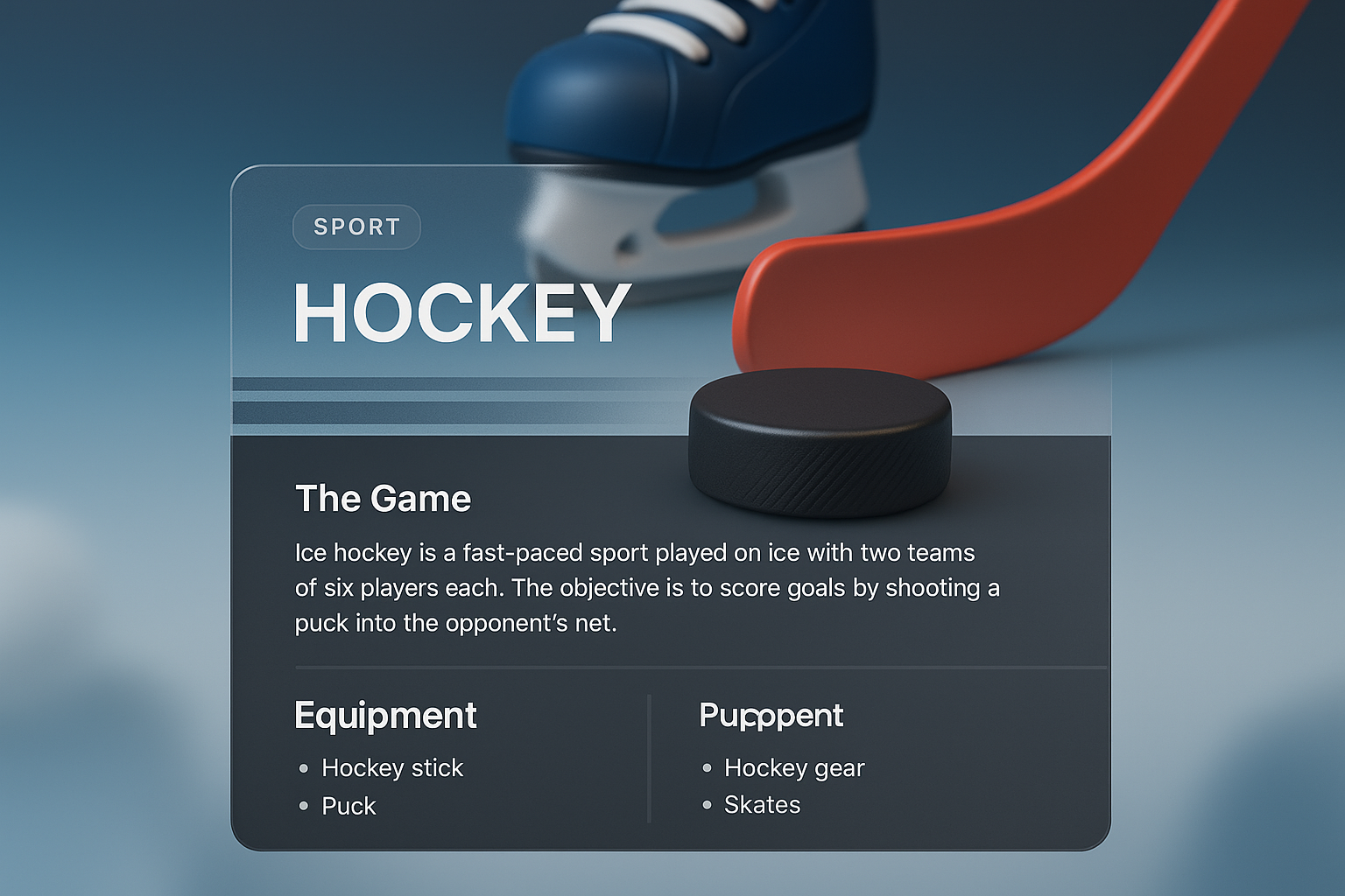 /Collection: /by davooda/Type: PNG/A visually engaging web page layout featuring a 3D hockey illustration, incorporating dark overlays and transparent effects. Includes sections for game details and equipment.