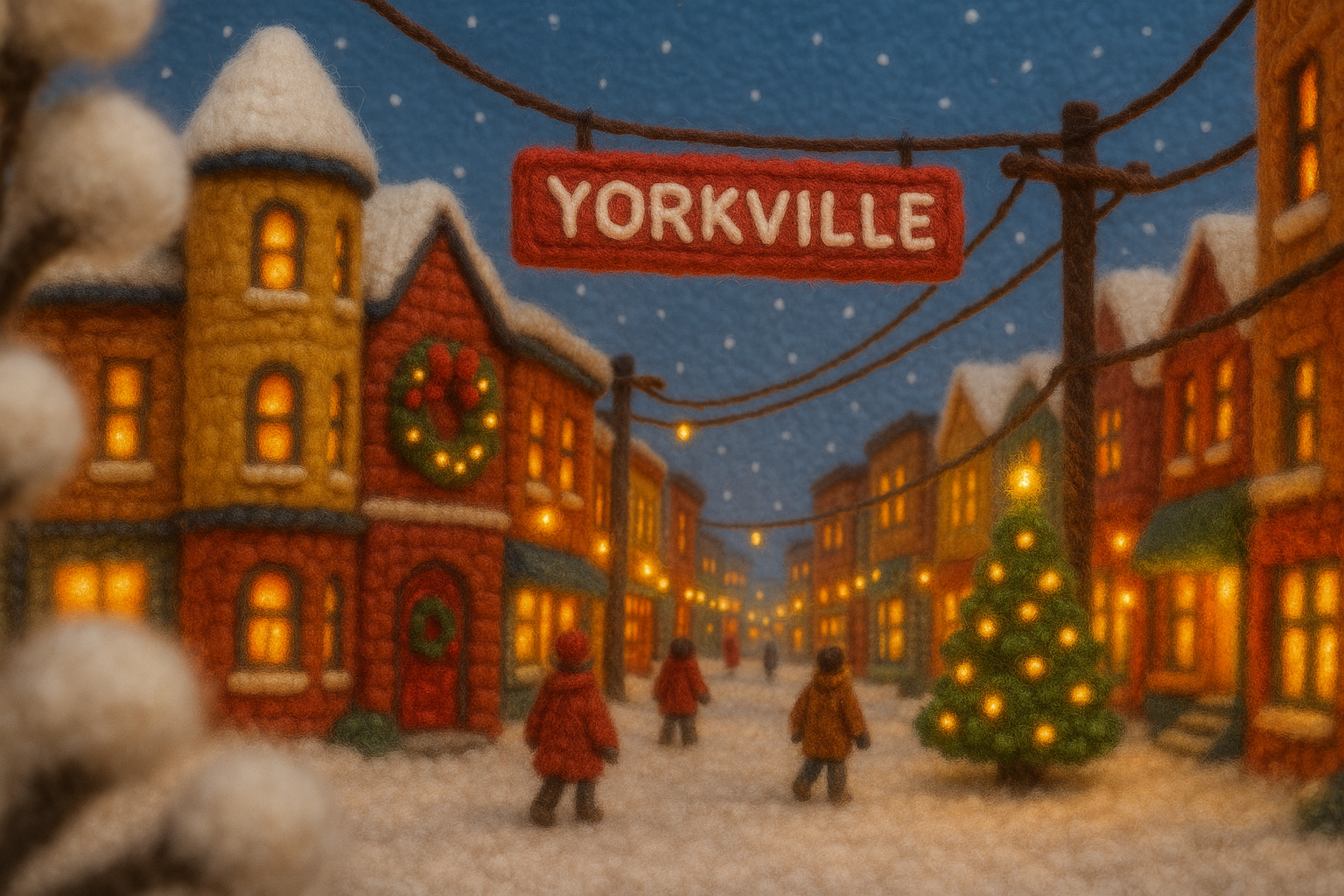 A beautifully crafted winter scene depicting Yorkville, Toronto. The image features vibrant colors, a snowy atmosphere, and small figures walking amidst cozy, wool-like buildings adorned with festive lights.