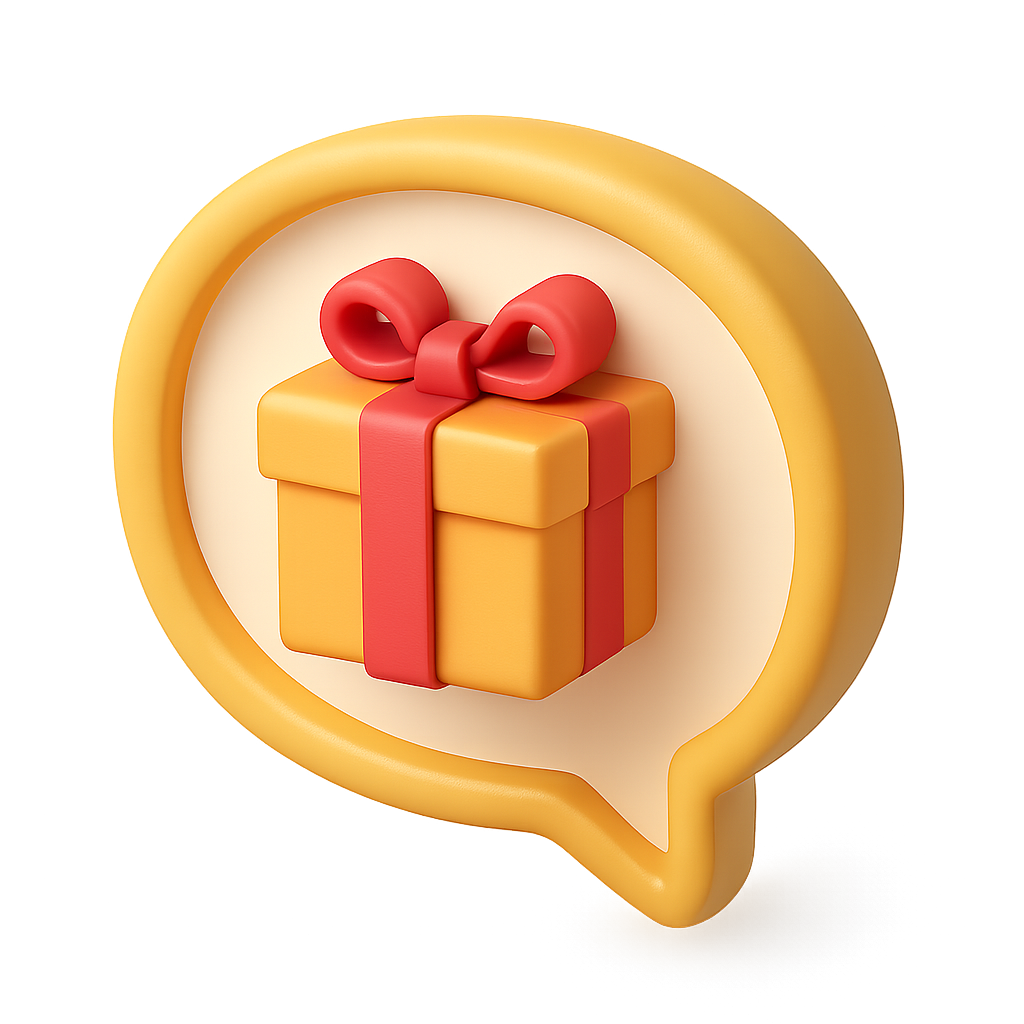 A visually striking 3D icon of a gift box with a red ribbon, nestled inside a yellow speech bubble. The design features a three-quarter view, creating a volumetric feel.