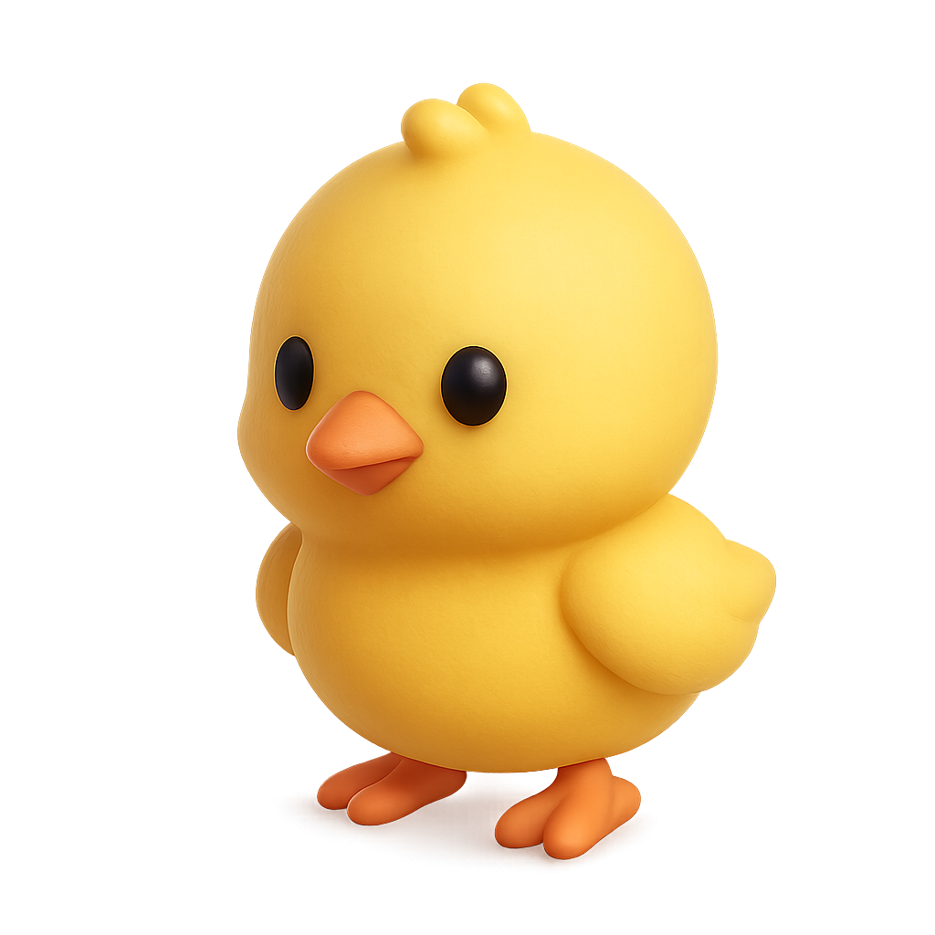 /Collection: /by davooda/Type: PNG/A cute 3D representation of a yellow baby chick, showcasing a smooth, rounded form with a glossy finish and a three-quarter view. The chick features large black eyes and a small orange beak, set against a softly illuminated background.