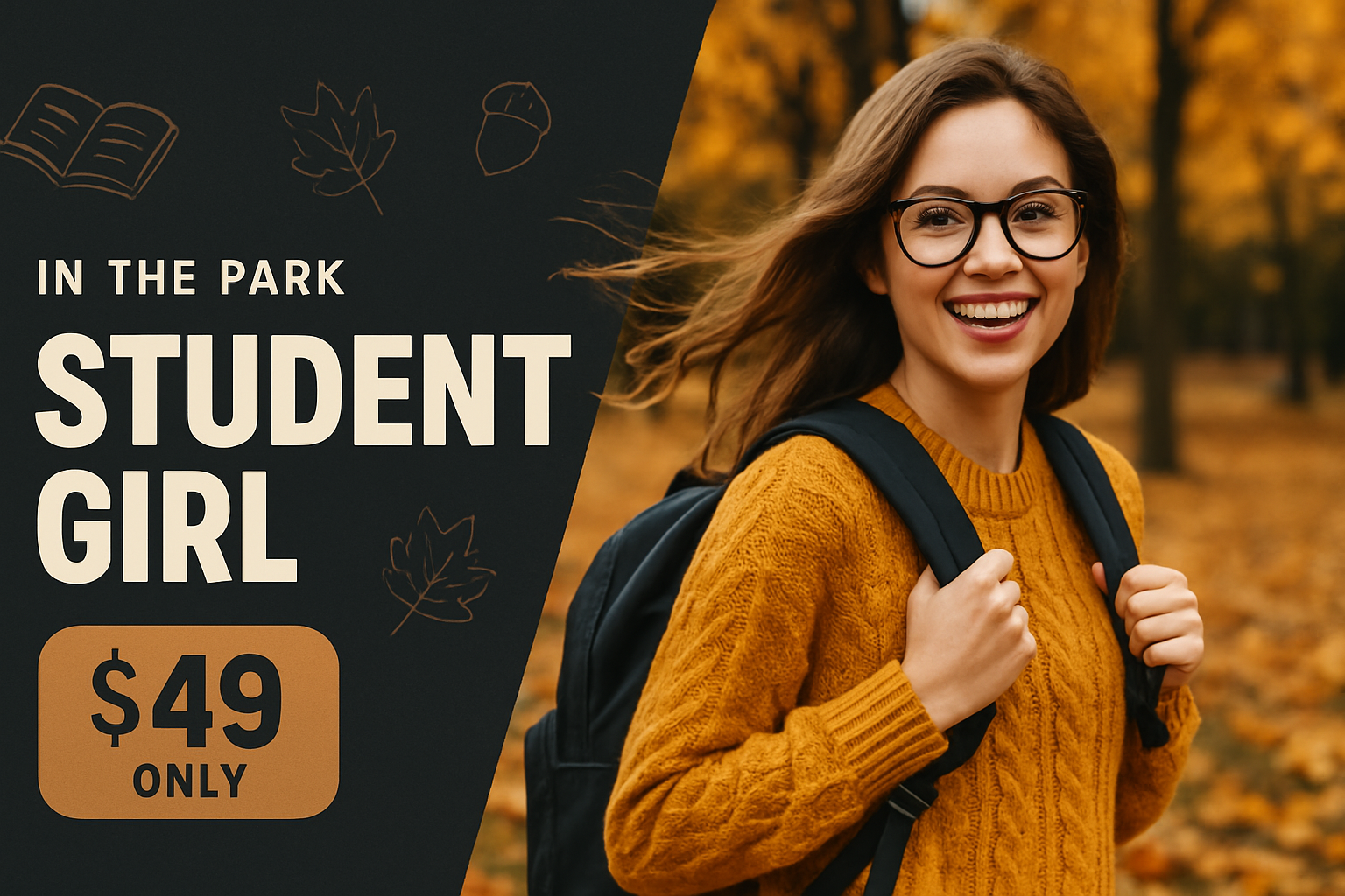 /Collection: /by davooda/Type: PNG/A vibrant advertisement showcasing a smiling student girl in glasses and a backpack, set against an autumn park background with warm colors and light textures. The layout features bold typography and a price tag, creating a modern, energetic look.