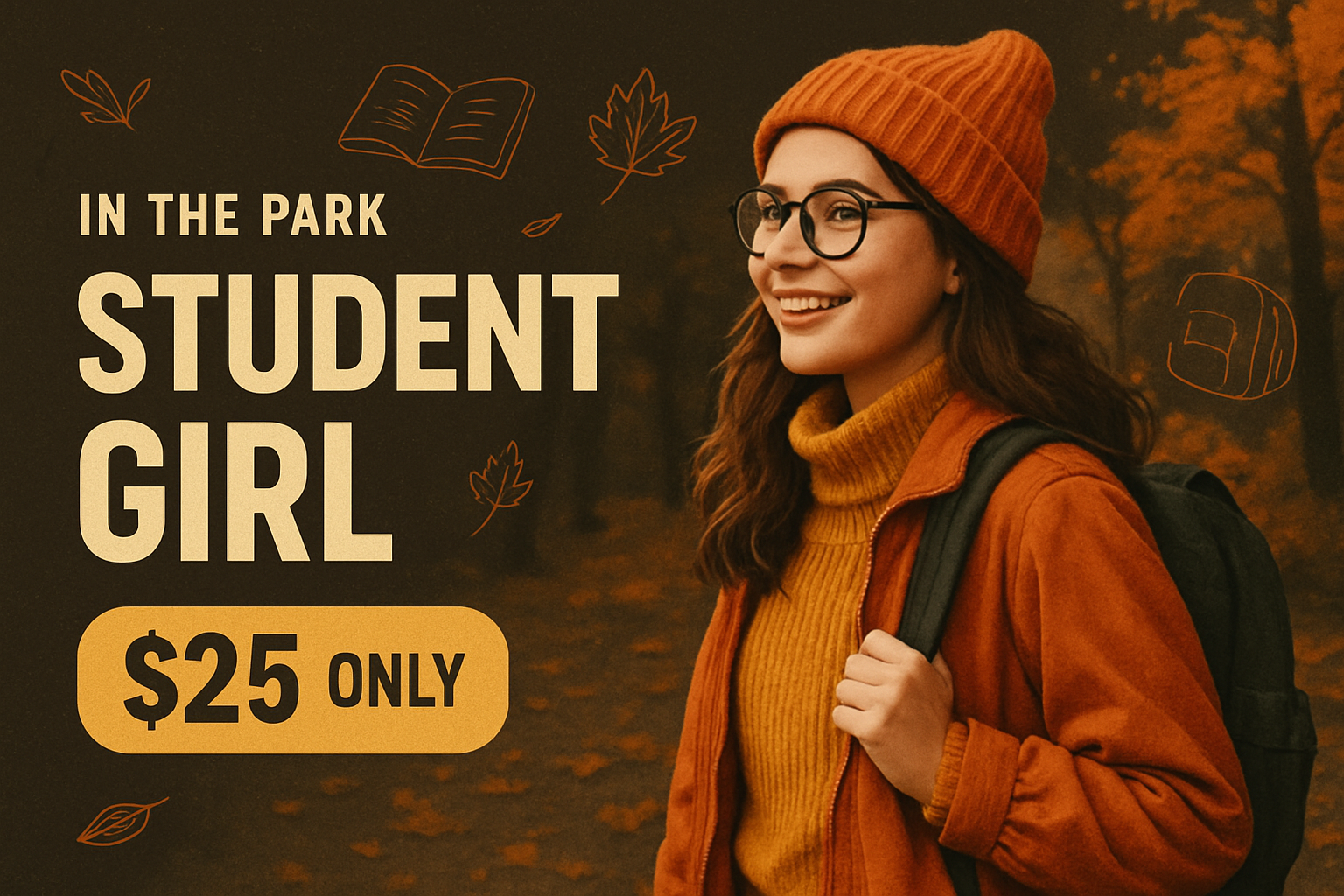 /Collection: /by davooda/Type: PNG/A stylish advertisement showcasing a student girl with glasses and a backpack in an autumn park. The background features light textures and simple contour drawings, with bold typography elements.