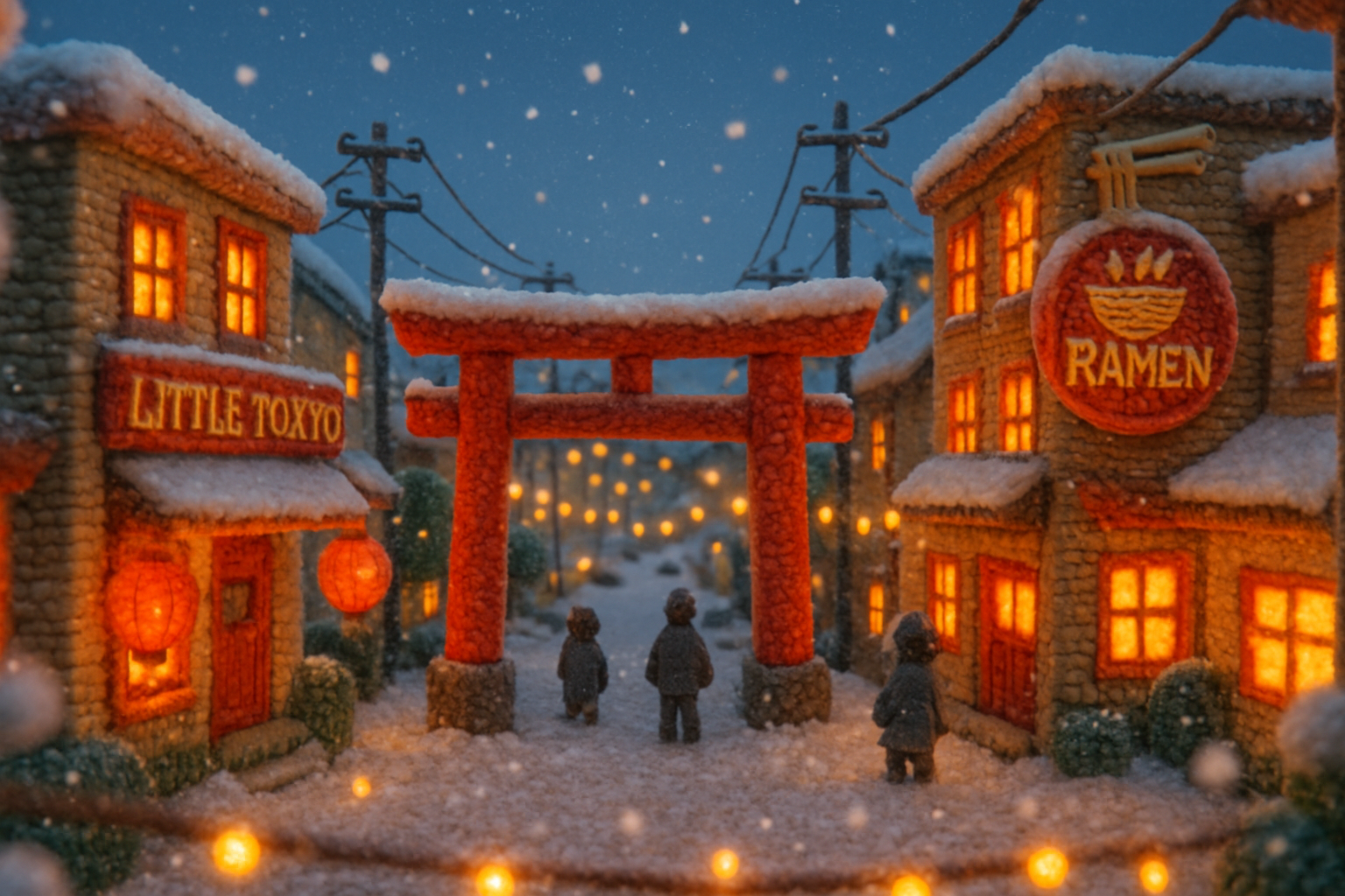 A charming winter scene depicting Little Tokyo in Los Angeles, crafted from wool-like textures. The streets are adorned with snow, glowing lights, and tiny figures, creating a festive atmosphere.