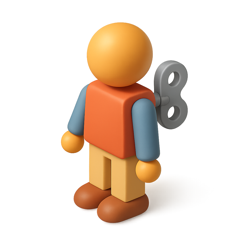 A vibrant 3D icon of a wind-up figure viewed from a three-quarter angle, showcasing bright colors and a playful design with a visible winding mechanism.