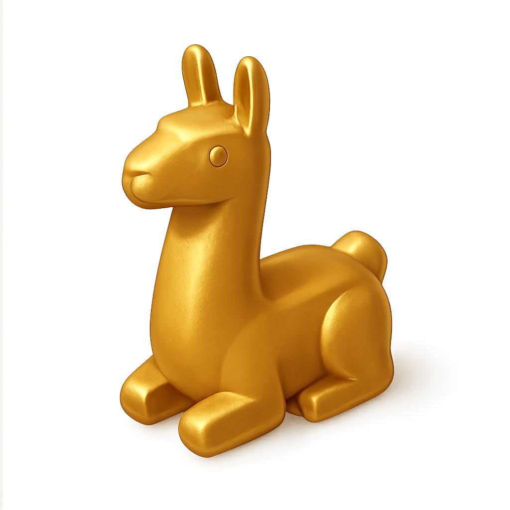 A glossy, golden llama icon rendered in a three-quarter isometric view. The design features smooth surfaces and a volumetric feel, set against a soft gradient background.