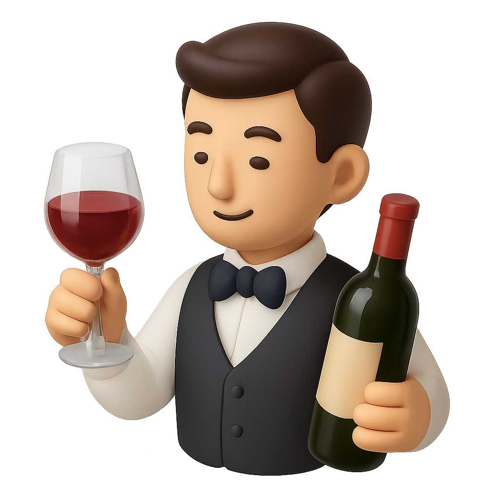 A charming 3D icon of a sommelier holding a wine glass and bottle, depicted in a three-quarter isometric view with a transparent background.