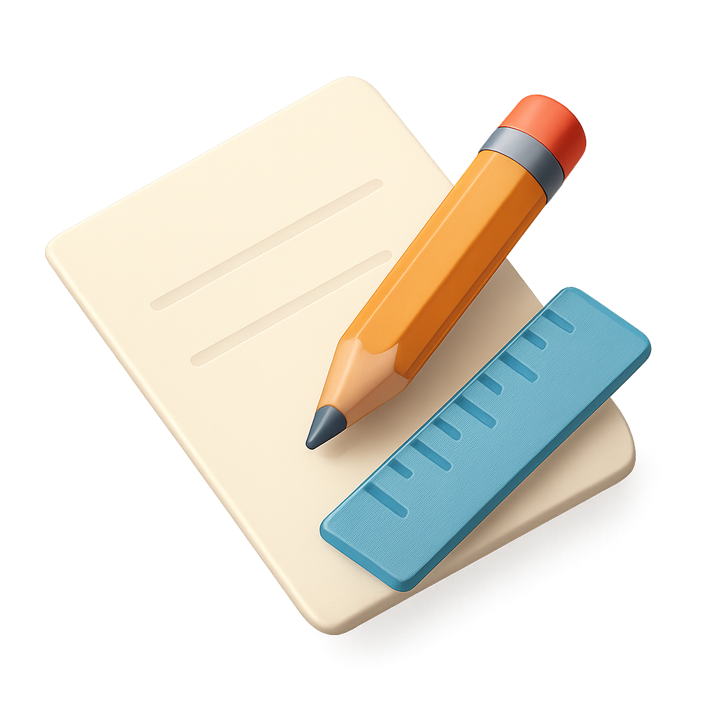 A 3D rendering of a pencil, ruler, and notepad displayed in a three-quarter view, emphasizing a volumetric and isometric design with a transparent background.