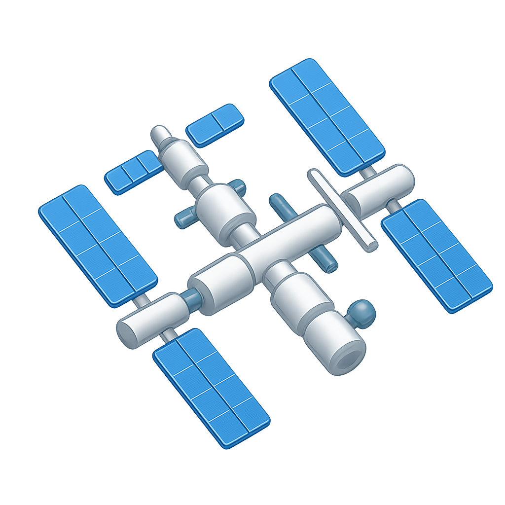 /Collection: /by davooda/Type: PNG/A 3D icon representation of an international space station, designed in a three-quarter view with a transparent background. It features a stylized structure with blue solar panels and a sleek, modern aesthetic.