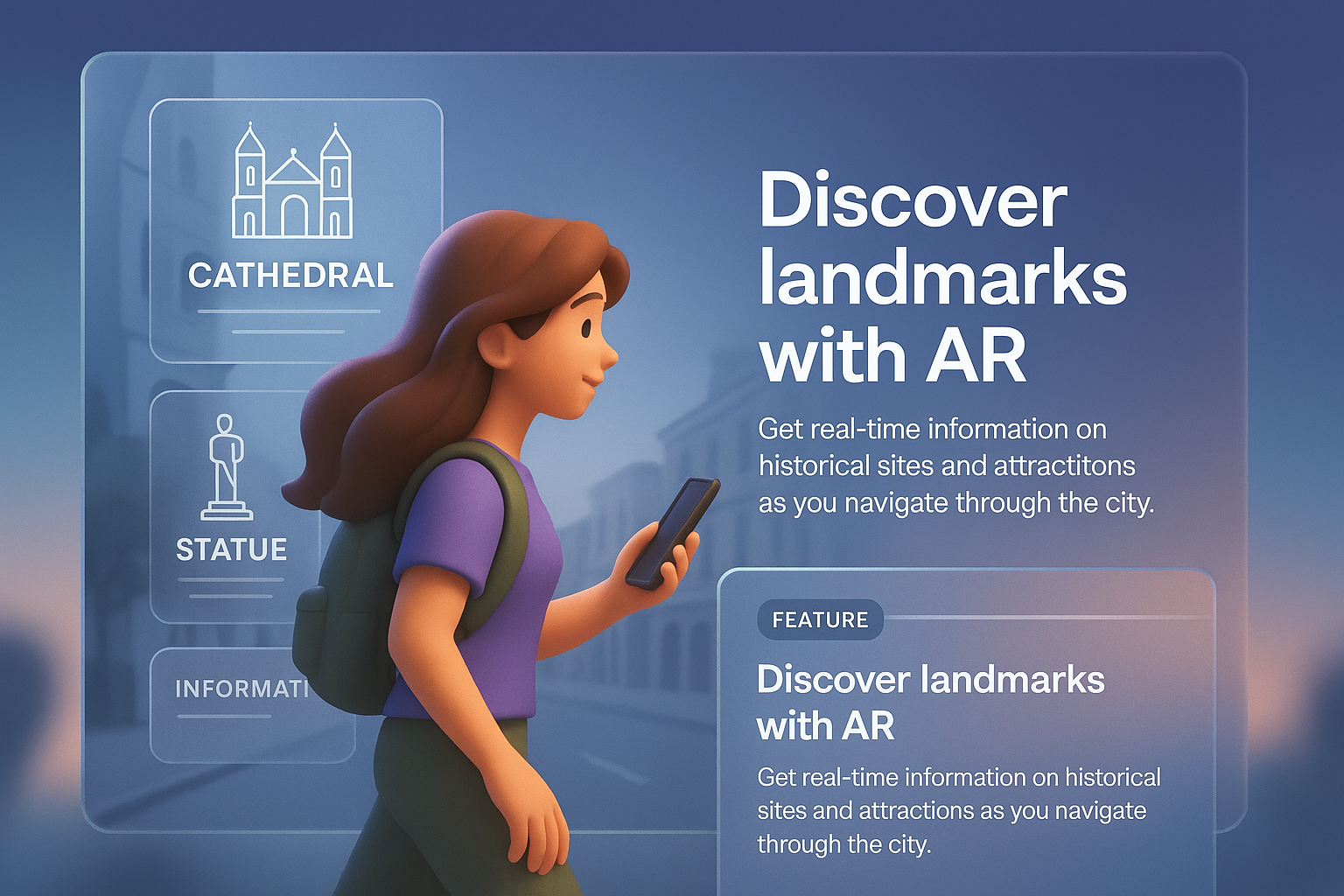 A young woman walking through a city street, engaging with AR prompts about nearby landmarks like a cathedral and statue. The design features a modern, layered composition for enhanced realism.