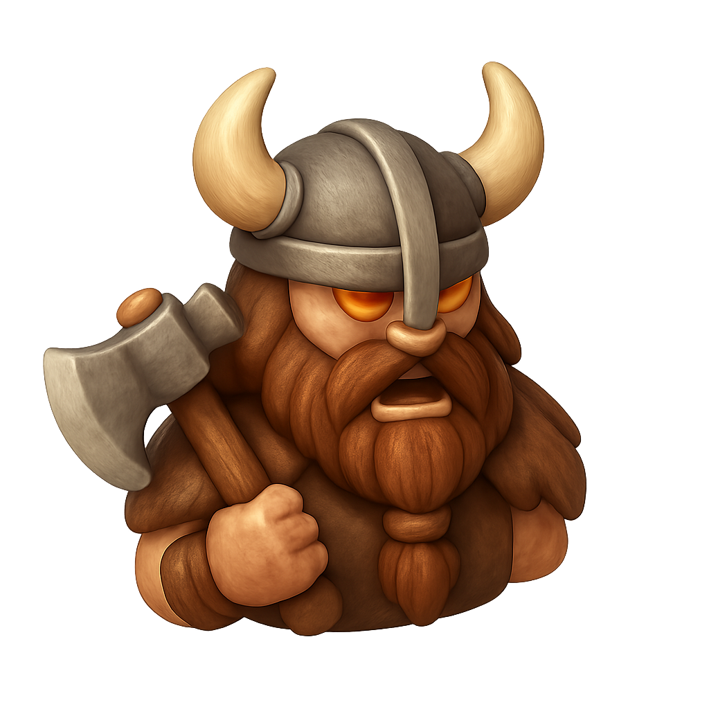 A stylized 3D icon of a Norse berserker featuring a horned helmet, an axe, and a fierce expression. The character has a detailed beard and a strong presence, set against a blurred background.