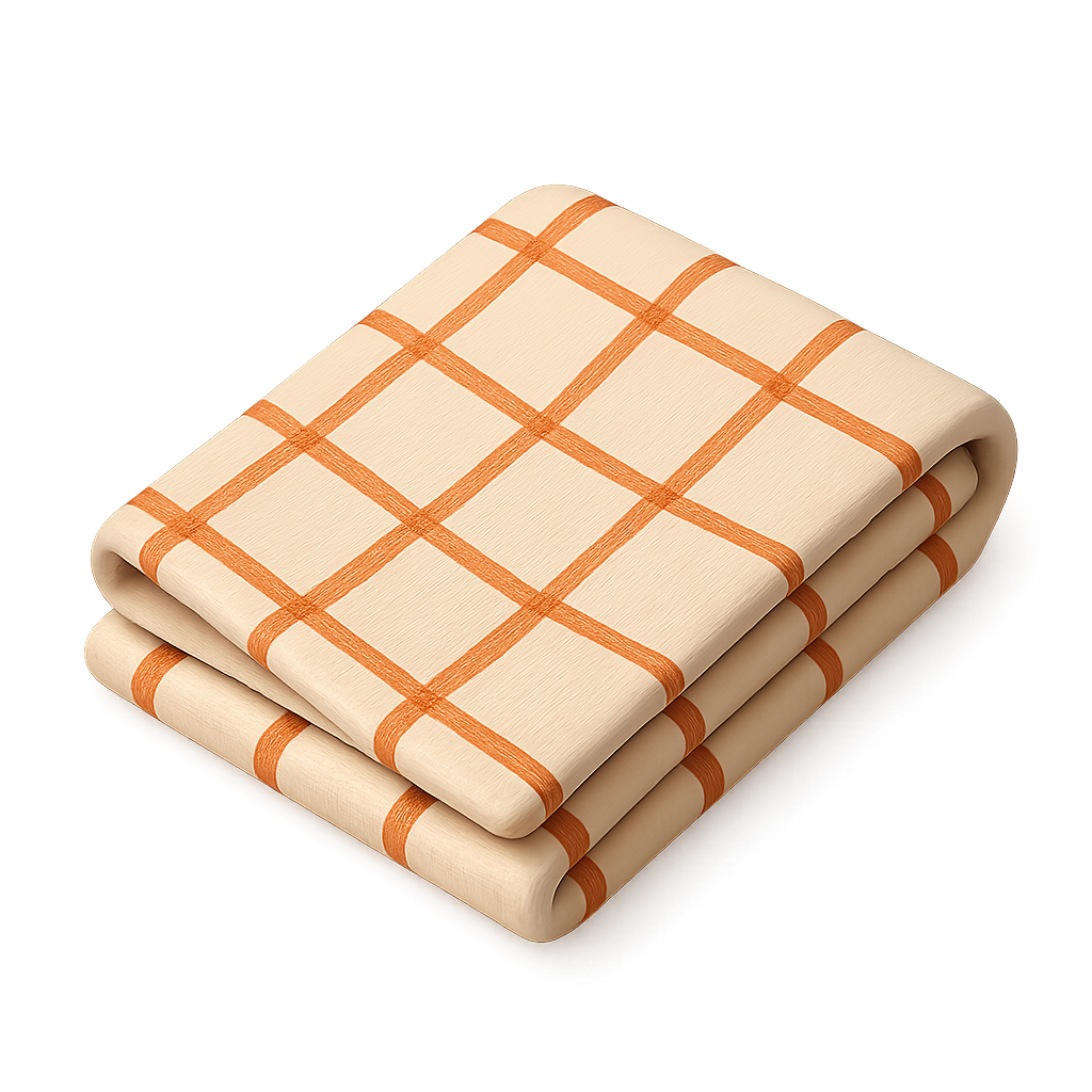 A visually appealing 3D icon of a folded dish towel featuring a grid pattern in orange and beige tones. The design is isometric with a transparent background.