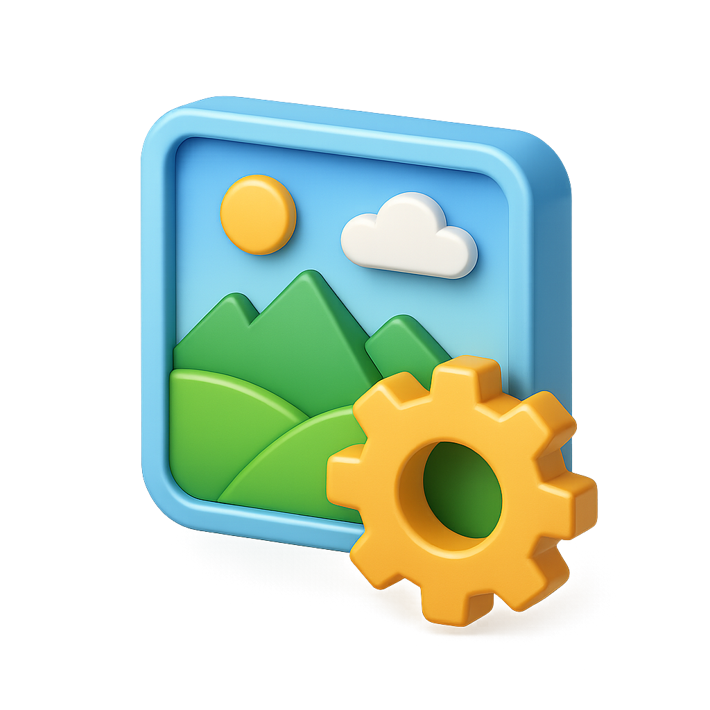A colorful 3D icon featuring a landscape with stylized mountains, a sun, and a cloud, accompanied by a prominent gear symbol, all presented in a three-quarter view.