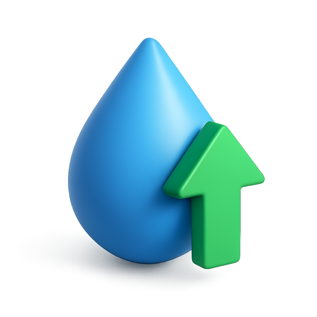 A vibrant 3D water drop icon in blue, featuring a green upward arrow. The design is isometric, with a three-quarter view, and a transparent background, creating a modern and volumetric look.
