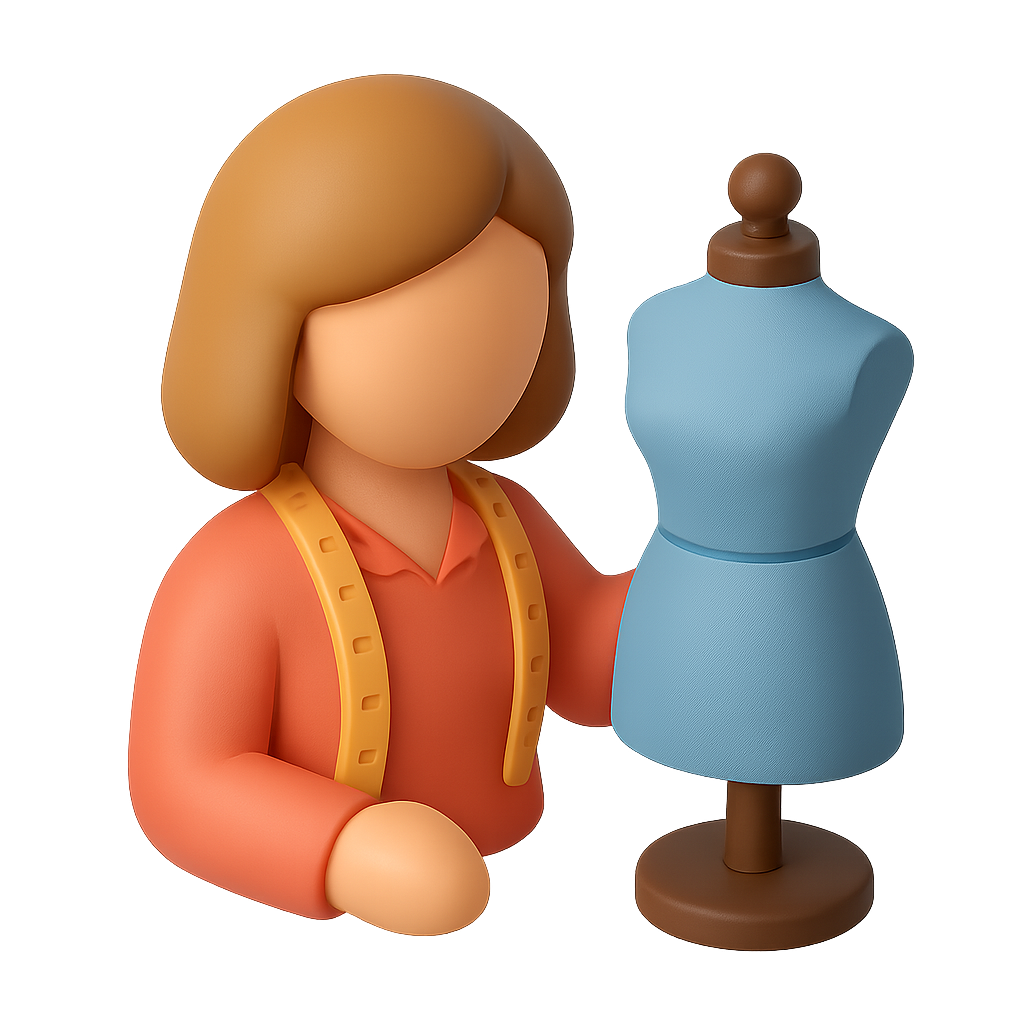 /Collection: /by davooda/Type: PNG/A stylized 3D seamstress icon, depicted in a three-quarter view, holding a dress form. The design features a soft color palette, with a focus on volumetric shapes and a transparent background.
