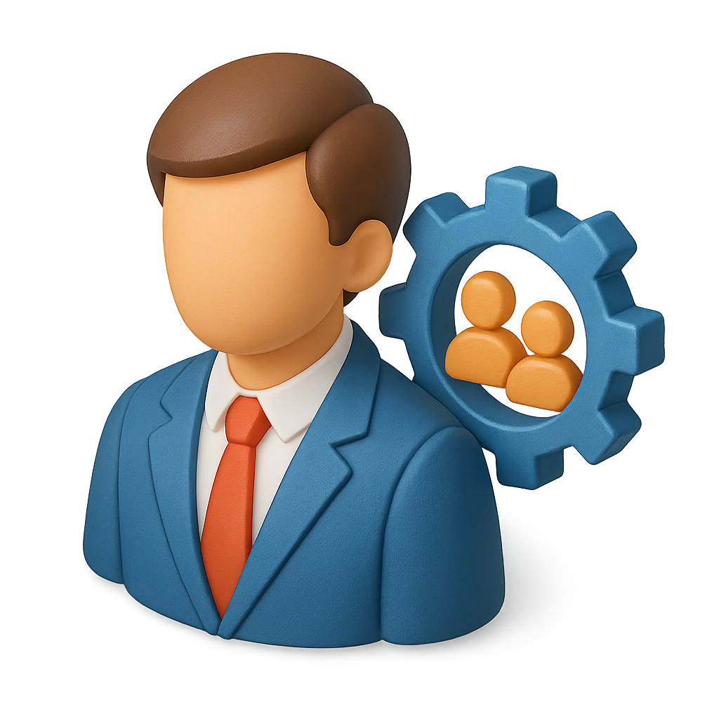 /Collection: /by davooda/Type: PNG/A vibrant 3D icon representing an employee relations specialist. The figure features a suit and tie with a gear symbol and two people icons, emphasizing teamwork and management.