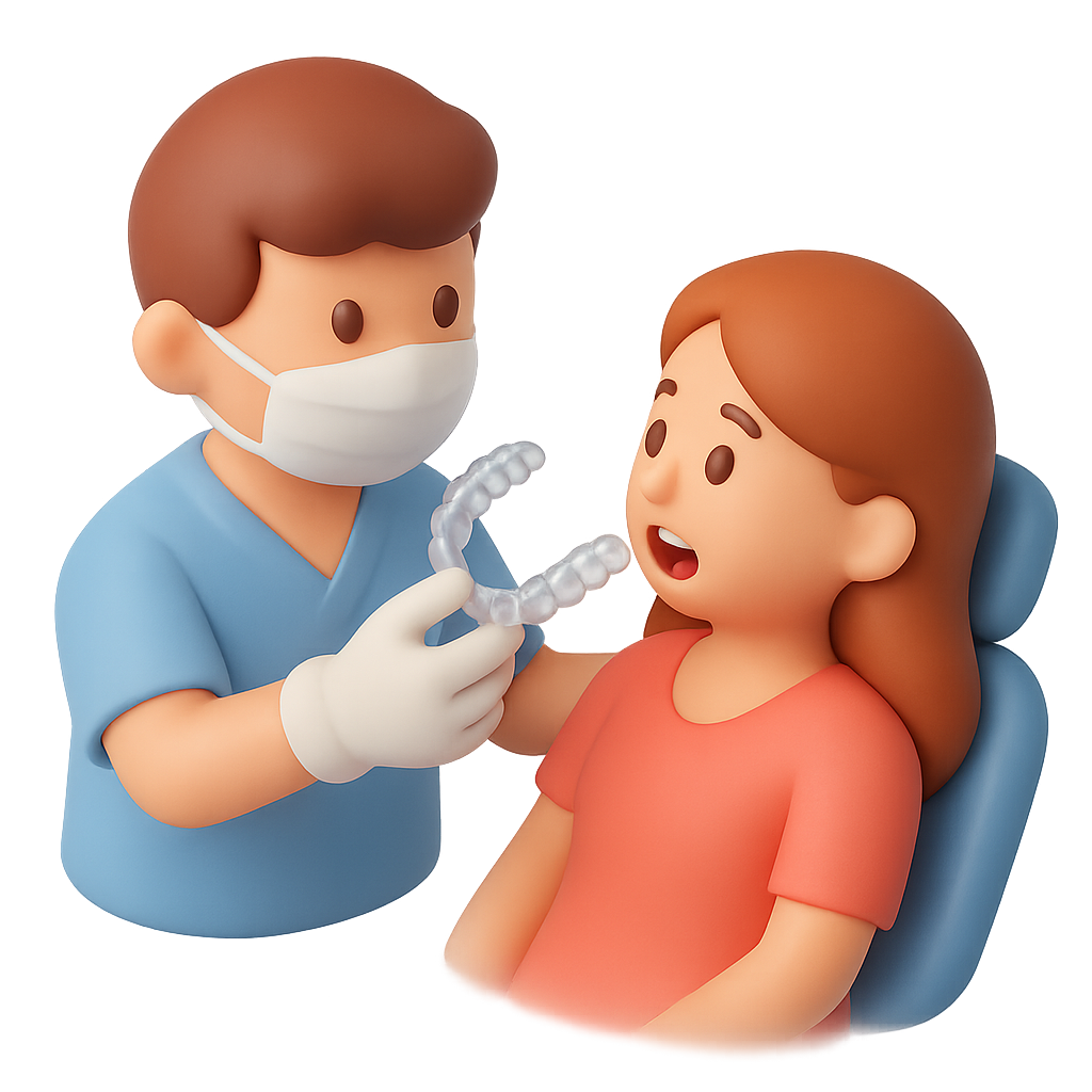 A 3D icon depicting a dentist wearing gloves and a mask presenting an Invisalign aligner to a patient in a dental chair. The scene has a soft, volumetric feel.