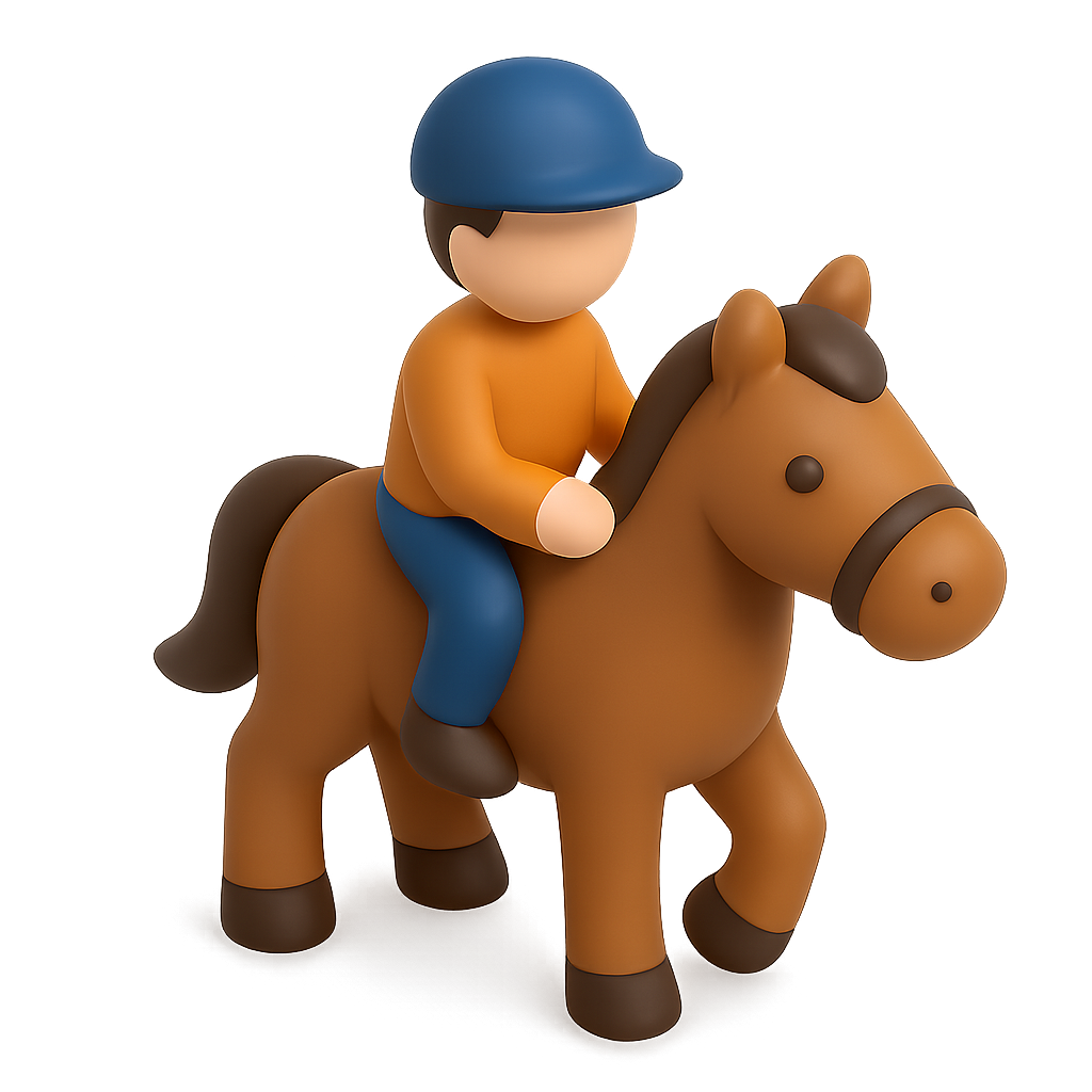 A stylized 3D icon of a person riding a horse, featuring a simple design with a transparent background. The figure is depicted in a three-quarter view, enhancing its volumetric feel.