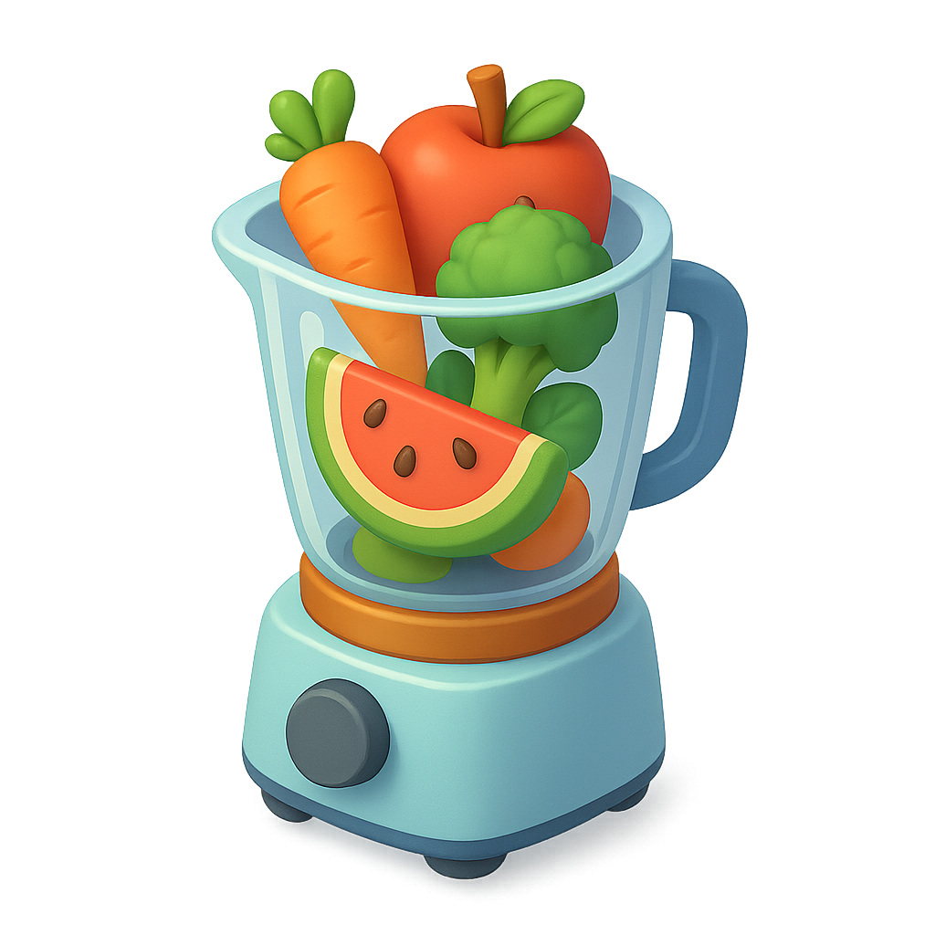 A vibrant 3D illustration of a blender filled with fresh fruits and vegetables, including watermelon, carrot, broccoli, apple, and more. The design features a smooth, isometric style with a transparent background.