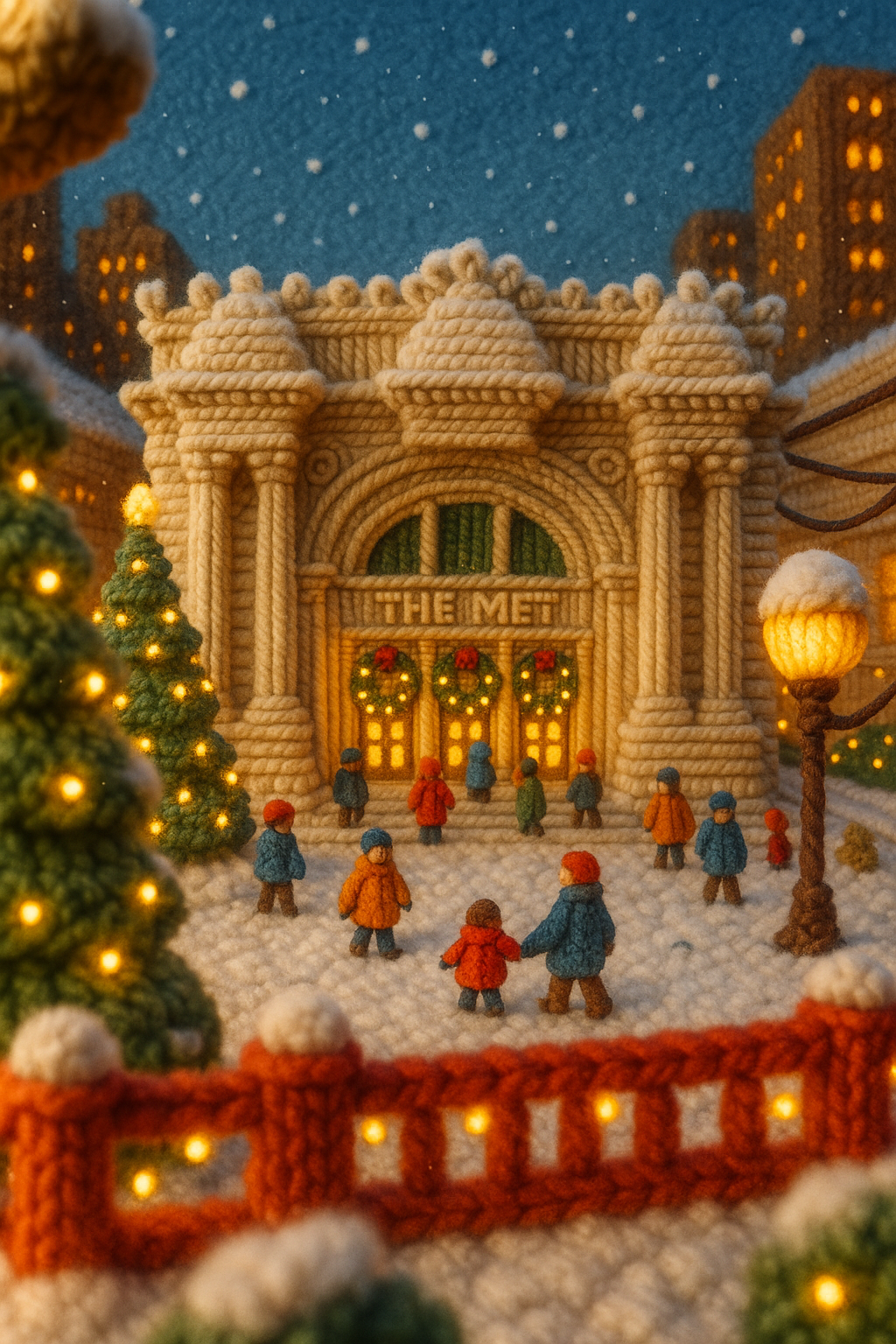 /Collection: /by davooda/Type: PNG/A whimsical 3D scene of the Metropolitan Museum of Art, crafted from yarn. The image features a snowy atmosphere with colorful lights, small figures, and a cozy holiday feel.