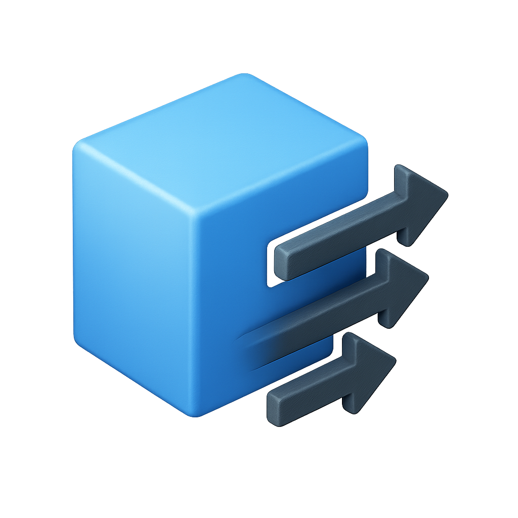 /Collection: /by davooda/Type: PNG/A sleek blue 3D icon depicted in a three-quarter view with a transparent background, illustrating movement through dynamic arrows, evoking a sense of length contraction.