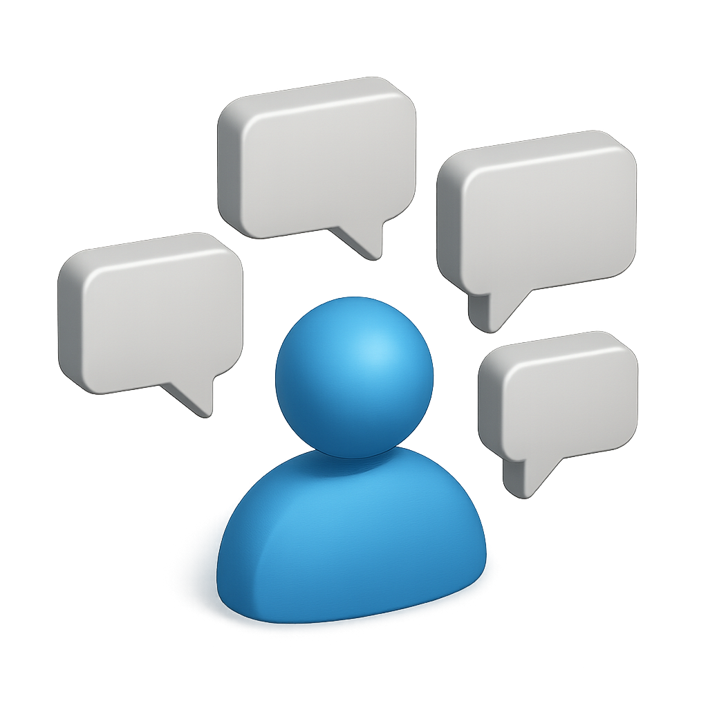 /Collection: /by davooda/Type: PNG/The image features multiple 3D speech bubbles arranged around a central blue figure. The bubbles are designed with a volumetric, isometric style and a transparent background.