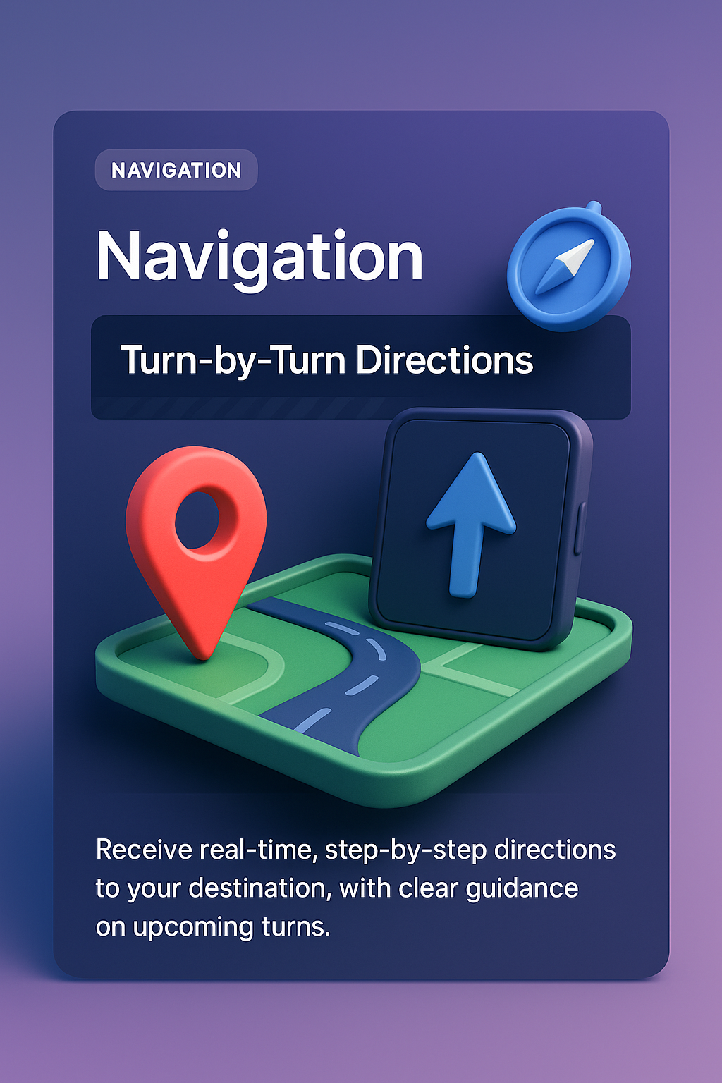 A vibrant 3D illustration showcasing navigation features, including a map, location pin, and directional icon. The design effectively integrates elements for a cohesive look.