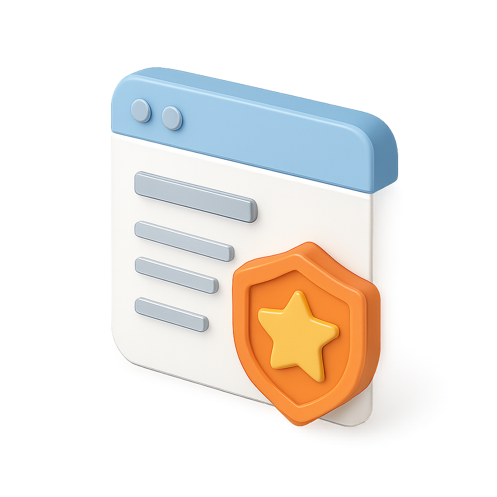 A vibrant 3D icon depicting a webpage with a badge, featuring a transparent background and isometric design. The badge has a star symbol for emphasis.