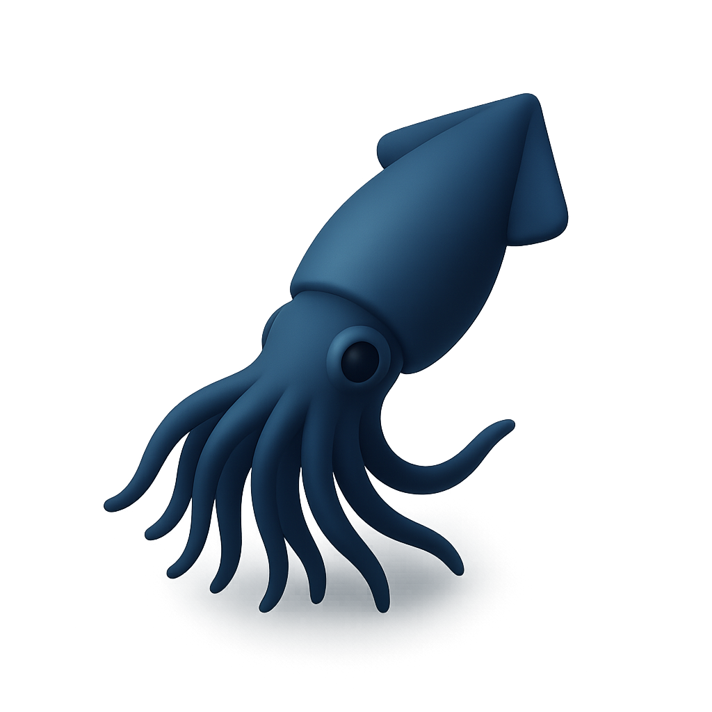 /Collection: /by davooda/Type: PNG/A stylish 3D icon of a squid swimming in deep water, showcasing a three-quarter view. The design features a smooth finish and a volumetric feel against a dark backdrop.