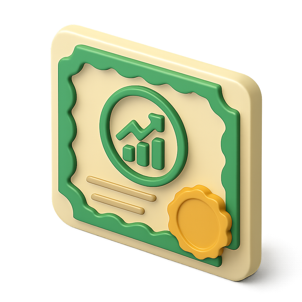 Stylized 3D Stock Certificate Icon with Graph and Seal