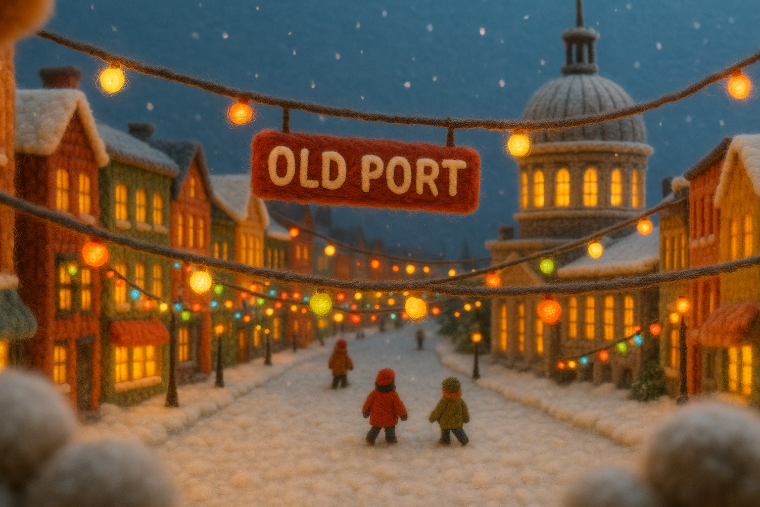 A cozy winter scene of Old Port, Montreal, featuring colorful buildings and festive lights, all crafted to resemble woolen textures. Snow gently falls as small figures stroll through the scene.