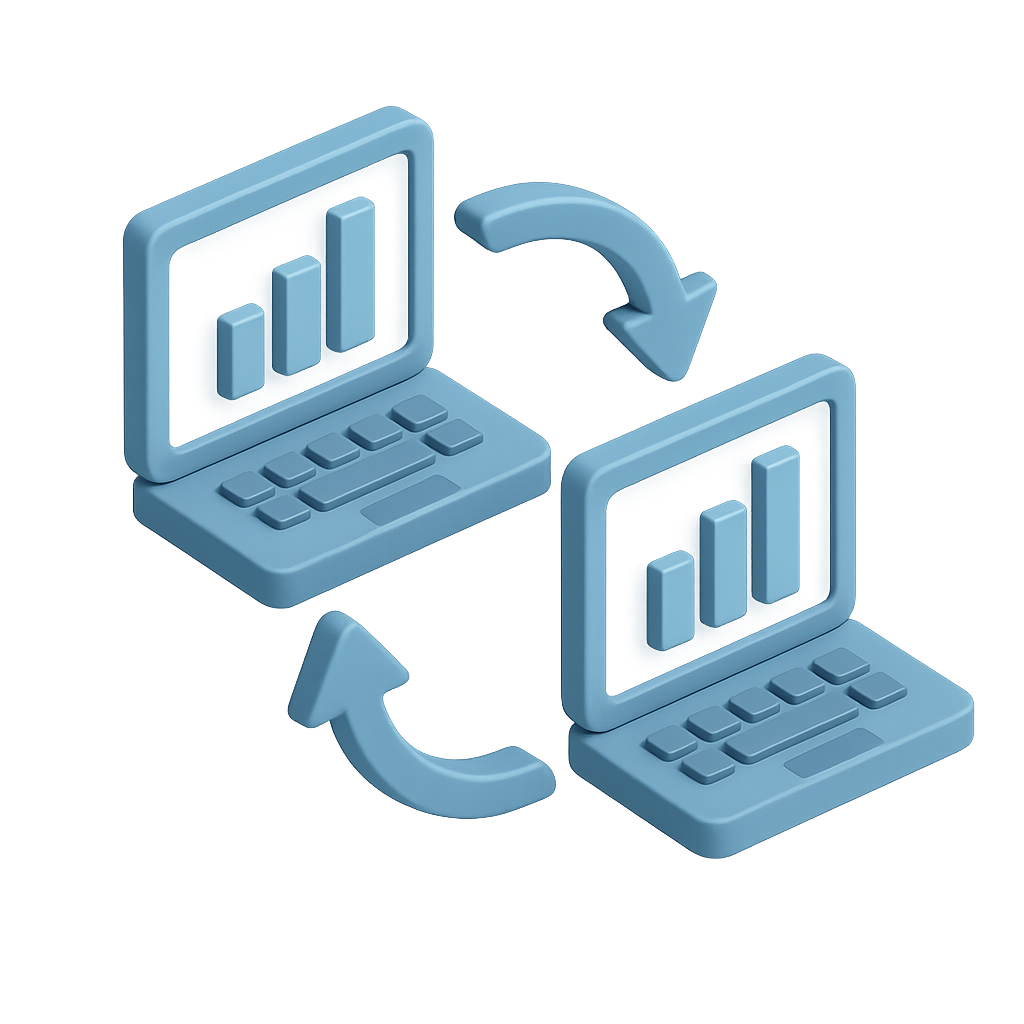 /Collection: /by davooda/Type: PNG/A visually striking 3D icon depicting two laptops with upward graphs and arrows, symbolizing digital twin simulations. The design features a transparent background and a three-quarter isometric view.