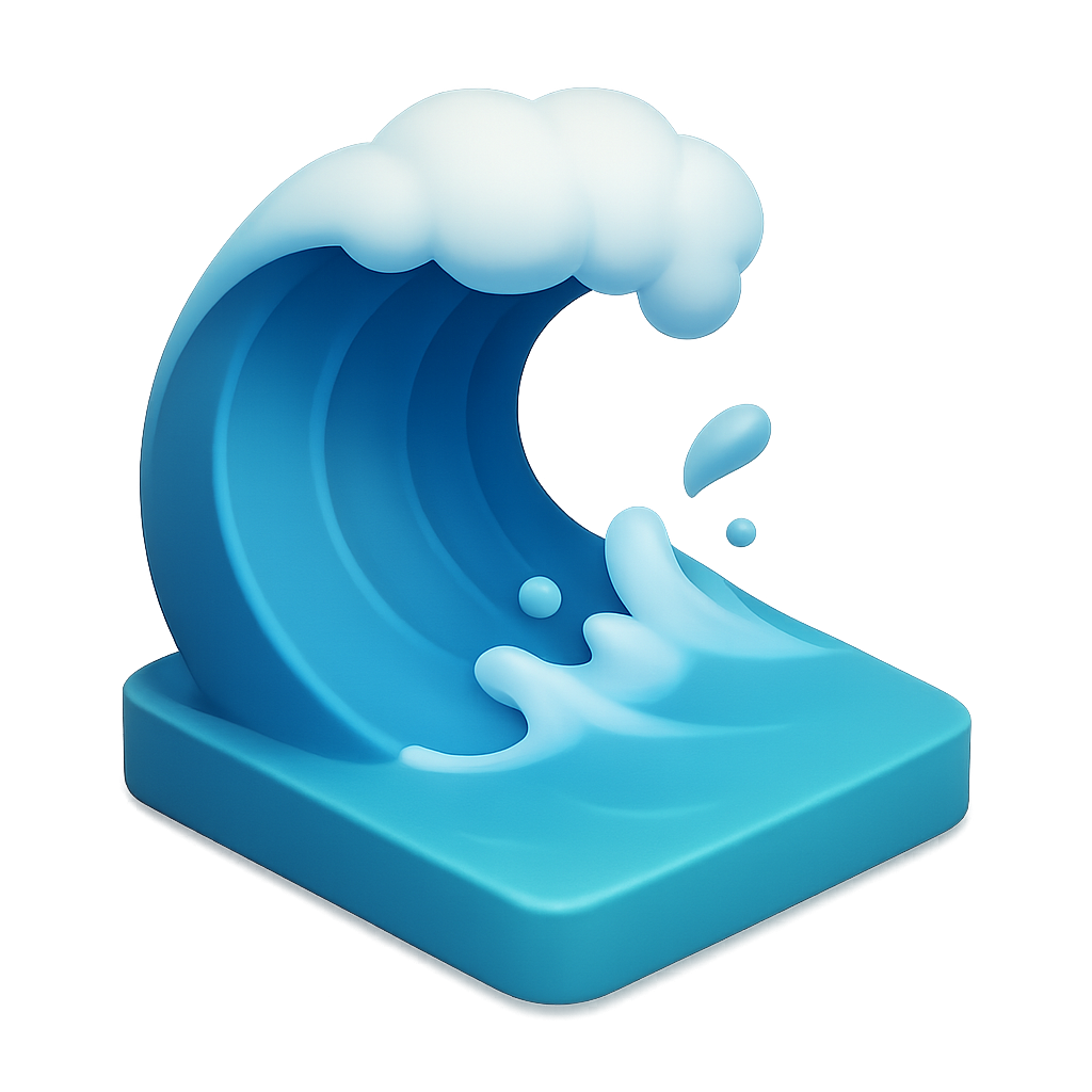 A visually striking 3D icon of a tsunami wave, designed with a smooth, volumetric appearance. The wave features a glossy texture and is shown from a three-quarter view, set against a subtle dark background.