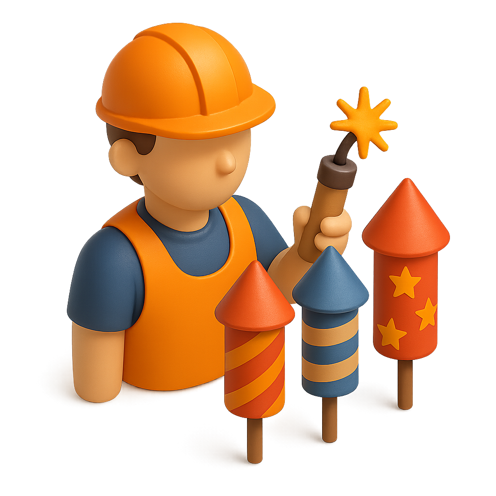 /Collection: /by davooda/Type: PNG/A stylized 3D icon depicting a pyrotechnician wearing an orange hard hat and vest, holding a firework launcher beside colorful fireworks. The scene has a vibrant, isometric feel.
