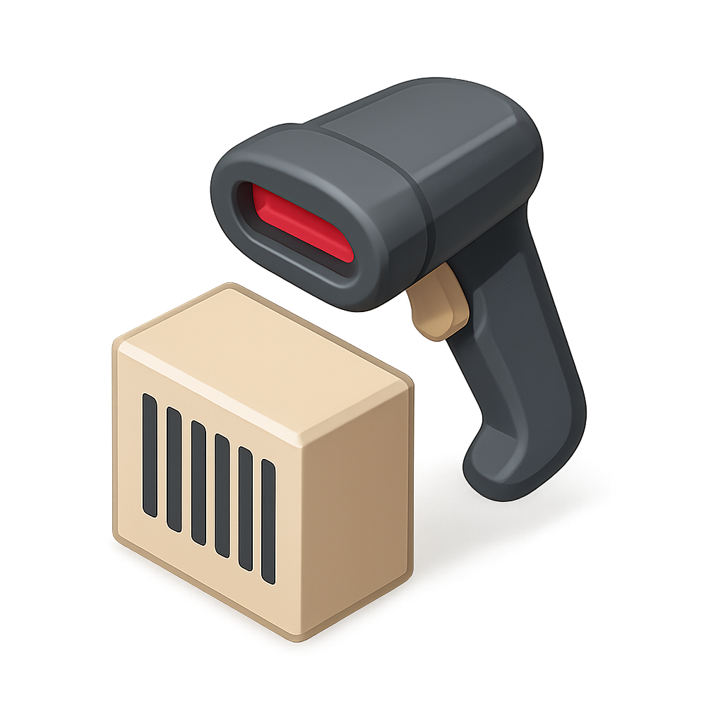 A stylized 3D icon of a barcode scanner with a sleek design, featuring a red scanning window and a beige box with black stripes, set against a smooth gradient background.